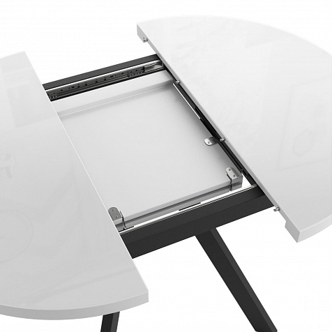 Раздвижной механизм «бабочка». Половинки столешницы отодвигаются в стороны, и внутренняя вставка устанавливается в центре. Стол расширяется на 35 см.