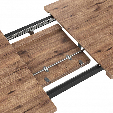 Раздвижной механизм «бабочка». Половинки столешницы отодвигаются в стороны, и внутренняя вставка устанавливается в центре. Стол расширяется на 40 см.