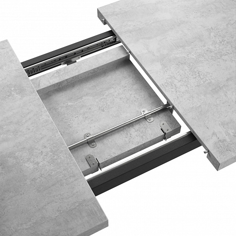 Раздвижной механизм «бабочка». Половинки столешницы отодвигаются в стороны, и внутренняя вставка устанавливается в центре. Стол расширяется на 32 см.