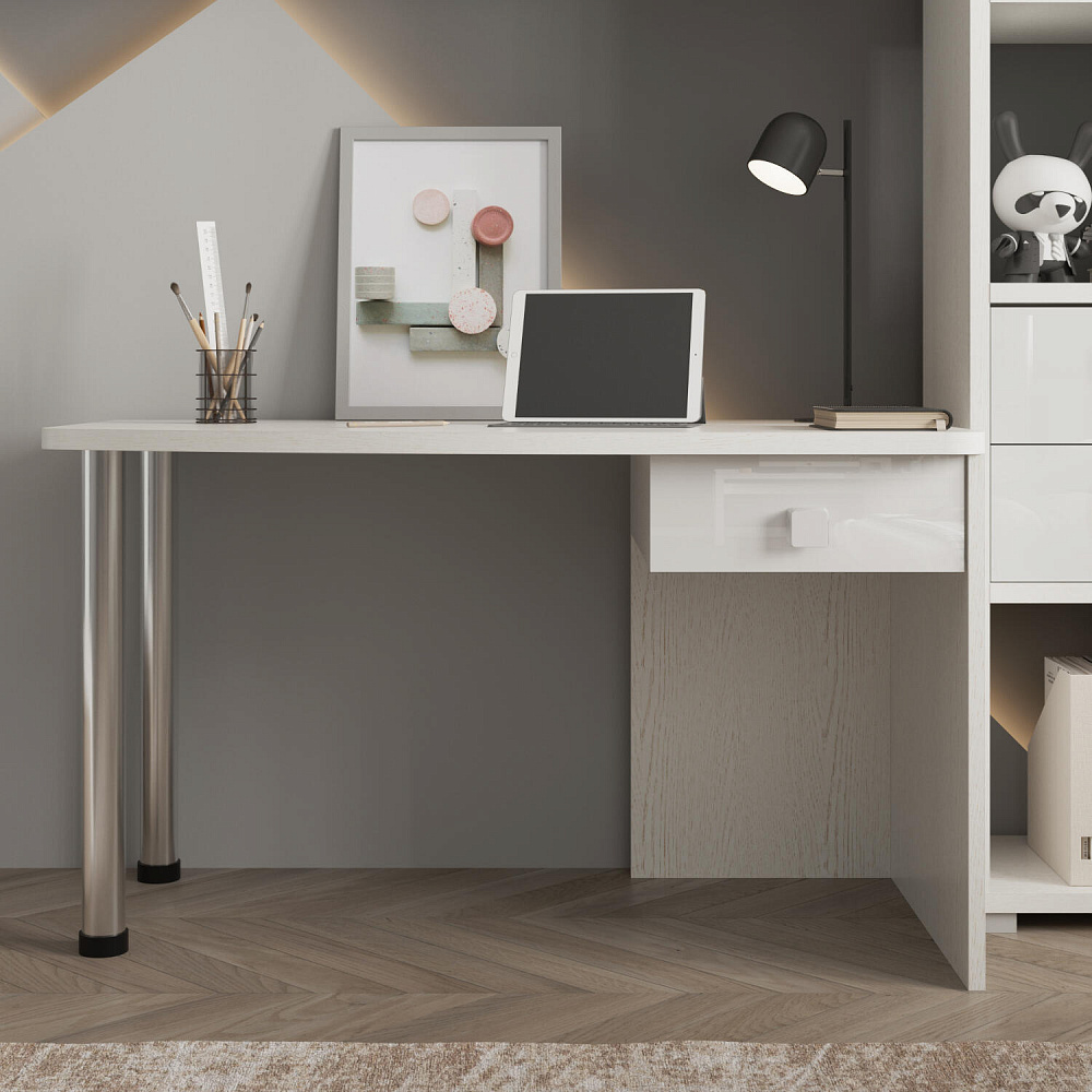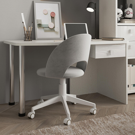 Эргономичная столешница. Просторная столешница закругленной формы позволяет поставить ноутбук, настольную лампу и разложить необходимые для учебы и творчества материалы.