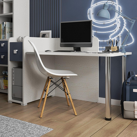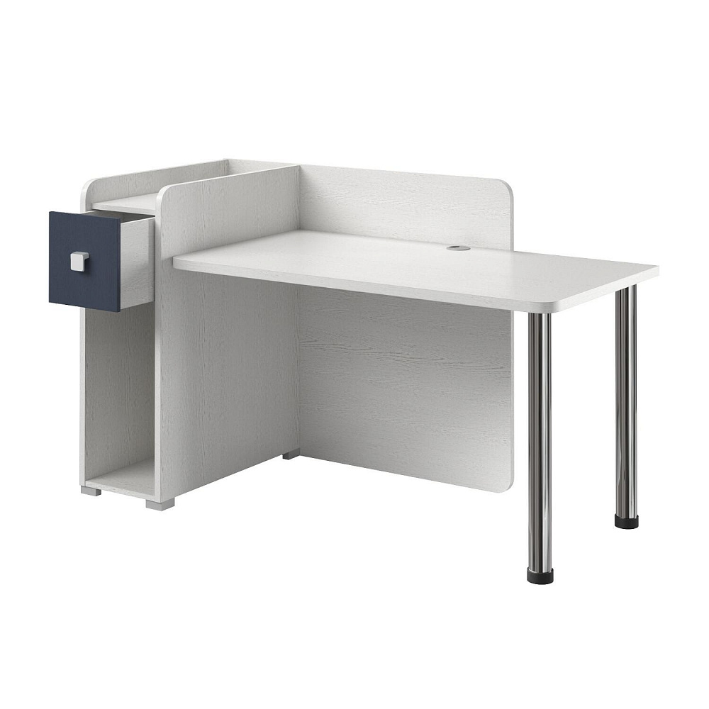 Просторная столешница. Широкая столешница позволяет установить компьютер и разложить необходимые для учёбы и творчества предметы. В крышке стола предусмотрено отверстие с заглушкой для вывода проводов.