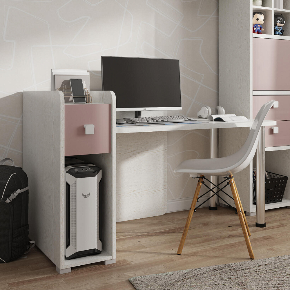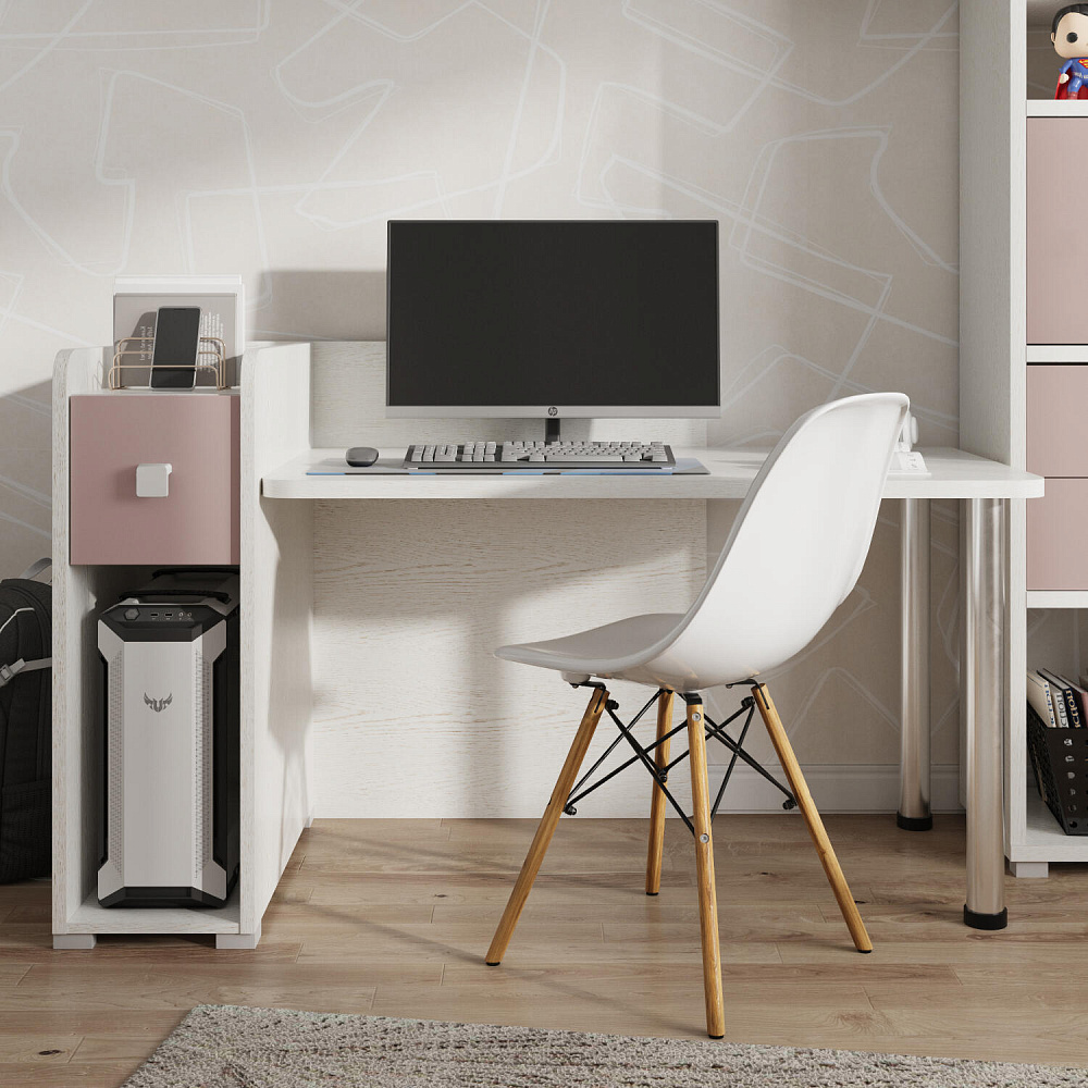 Вместительность. Функциональная тумба имеет пространство для установки системного блока, над ней предусмотрен ящик, а за ящиком есть органайзер с двумя отделениями для канцелярских мелочей.