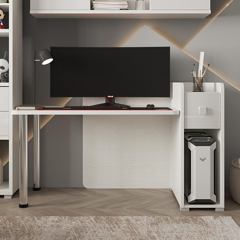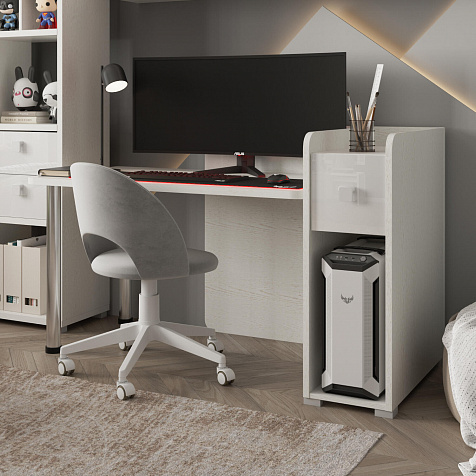 Вместительность. Функциональная тумба имеет пространство для установки системного блока, над ней предусмотрен ящик, а за ящиком есть органайзер с двумя отделениями для канцелярских мелочей.