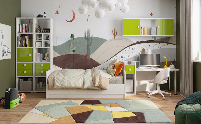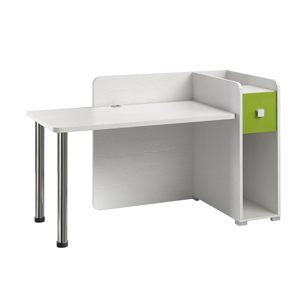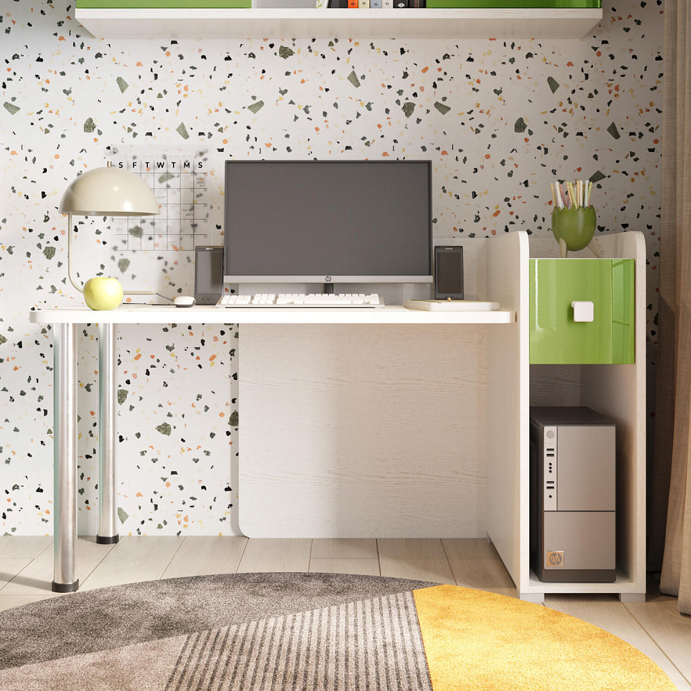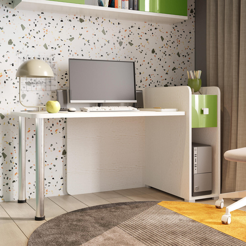 Просторная столешница. Широкая столешница позволяет установить компьютер и разложить необходимые для учёбы и творчества предметы. В крышке стола предусмотрено отверстие с заглушкой для вывода проводов.