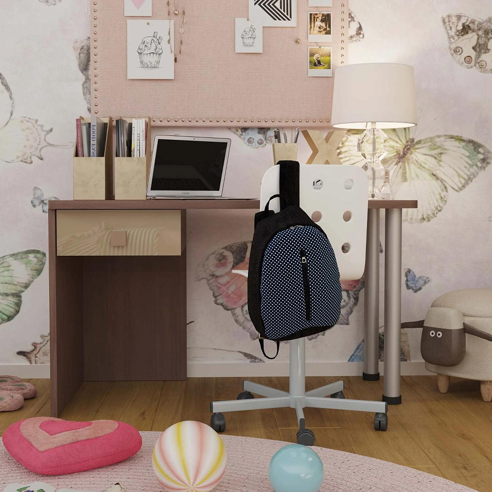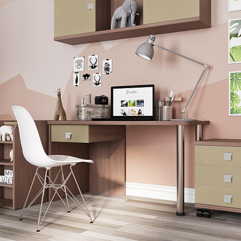 Эргономичная столешница. Просторная столешница закругленной формы позволяет поставить ноутбук, настольную лампу и разложить необходимые для учебы и творчества материалы.