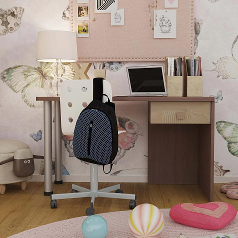 Эргономичная столешница. Просторная столешница закругленной формы позволяет поставить ноутбук, настольную лампу и разложить необходимые для учебы и творчества материалы.