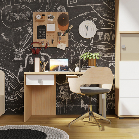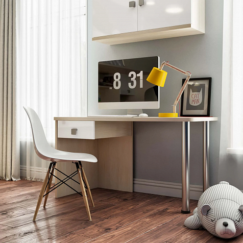 Эргономичная столешница. Просторная столешница закругленной формы позволяет поставить ноутбук, настольную лампу и разложить необходимые для учебы и творчества материалы.