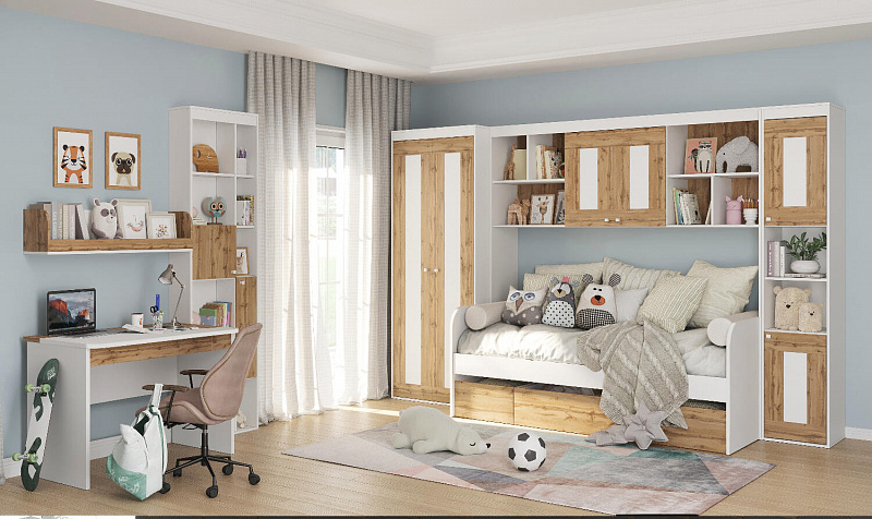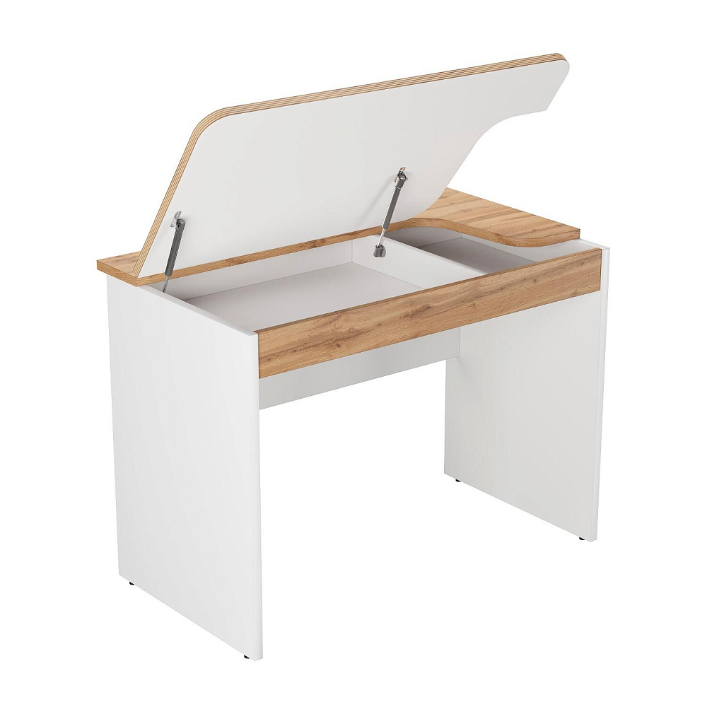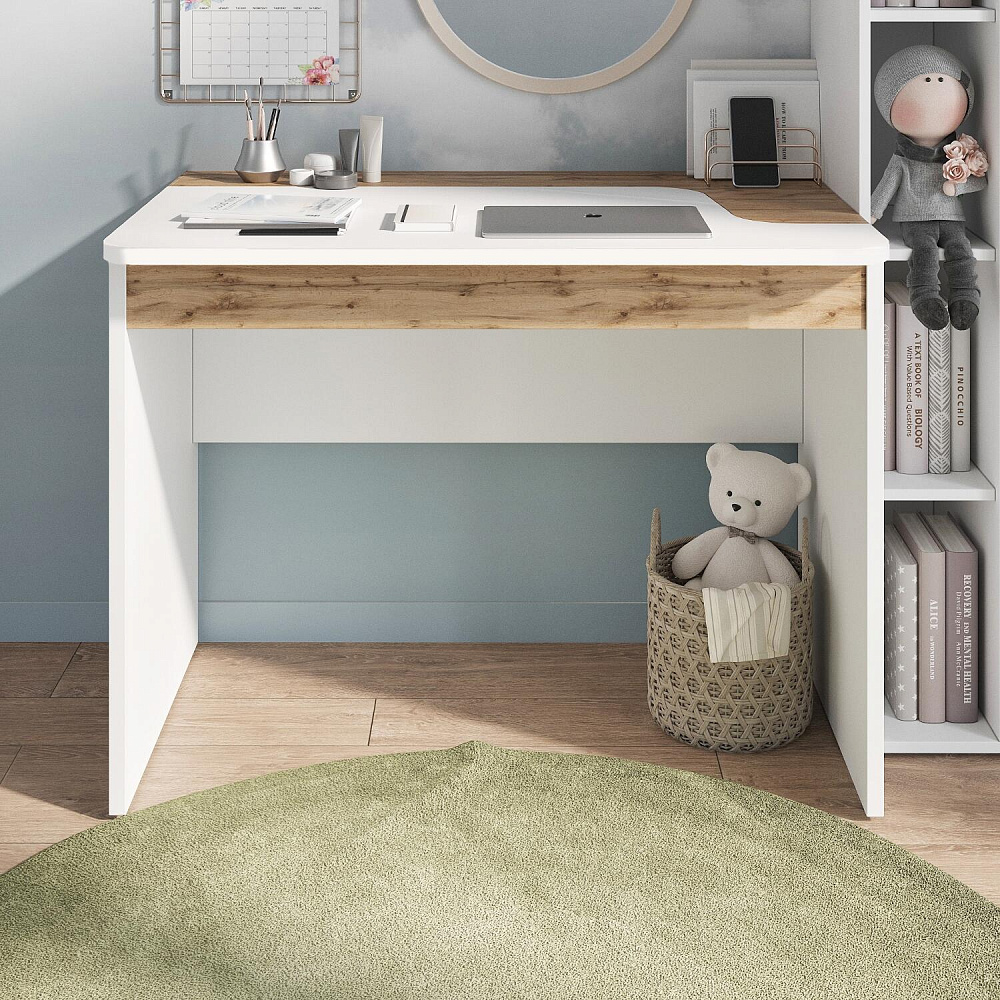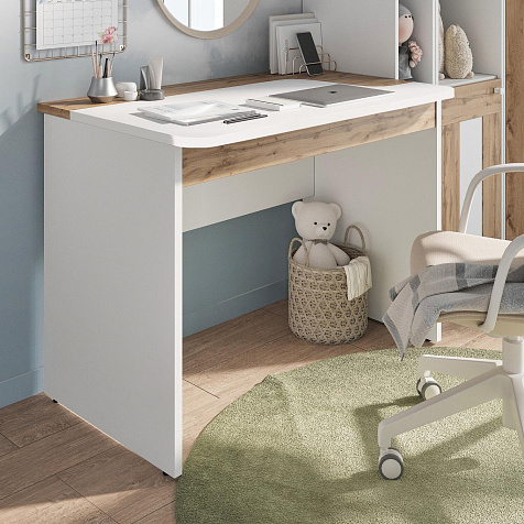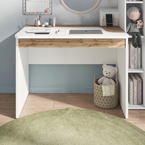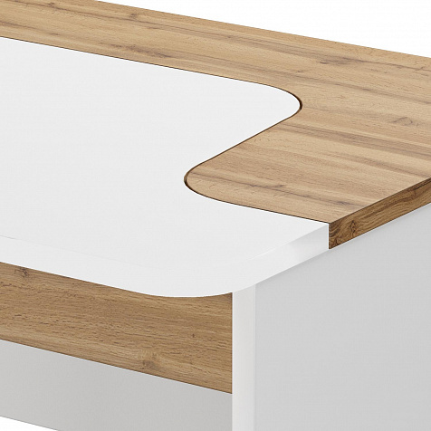 Левый письменный стол «Аллегро» с функциональной столешницей сделает выполнение домашних заданий максимально удобным. Благодаря двум отделениям под крышкой и подъёмному механизму возможен быстрый доступ к хранящимся внутри столешницы школьным принадлежностям. Таким образом, под рукой ребёнка находятся все самые необходимые предметы, а стол рационально использует пространство комнаты, не требует покупки дополнительной тумбы для хранения. Приятное сочетание белого цвета и древесного декора наполнит интерьер детской светом и теплом.