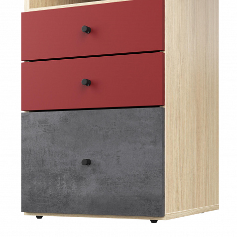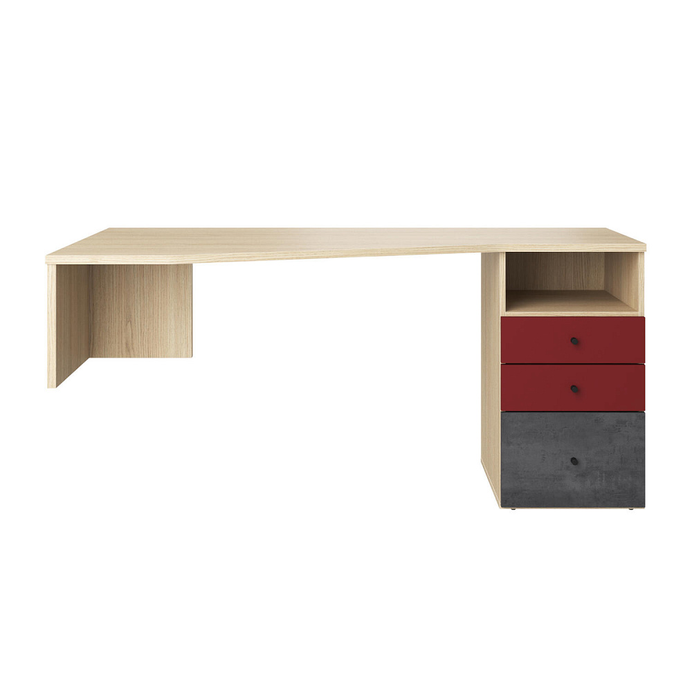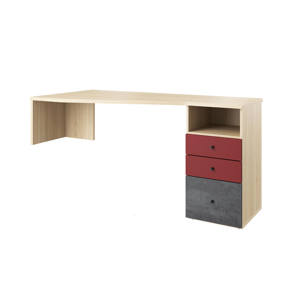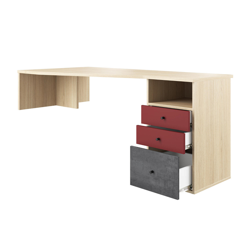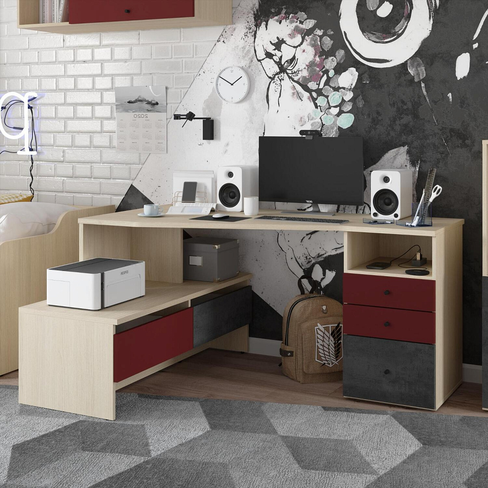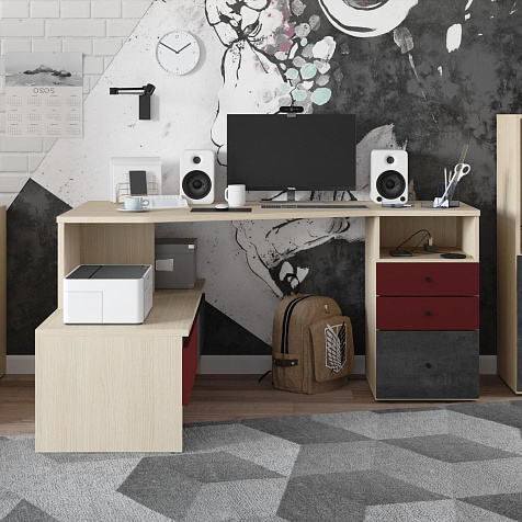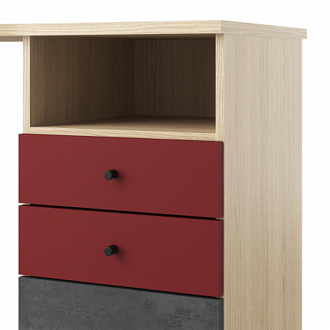 Письменный стол «Джелато» представлен в правостороннем исполнении, имеет большую рабочую зону. Такая модификация письменного стола решает вопрос расстановки мебели в небольших детских. Светлый корпус с нежной древесной текстурой, фасады в красивом дуэте глубокого серого и бордо, сделают интерьер детской стильным и современным. Коллекция «Джелато» удачно сочетает в себе стиль и комфорт.