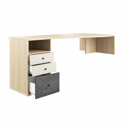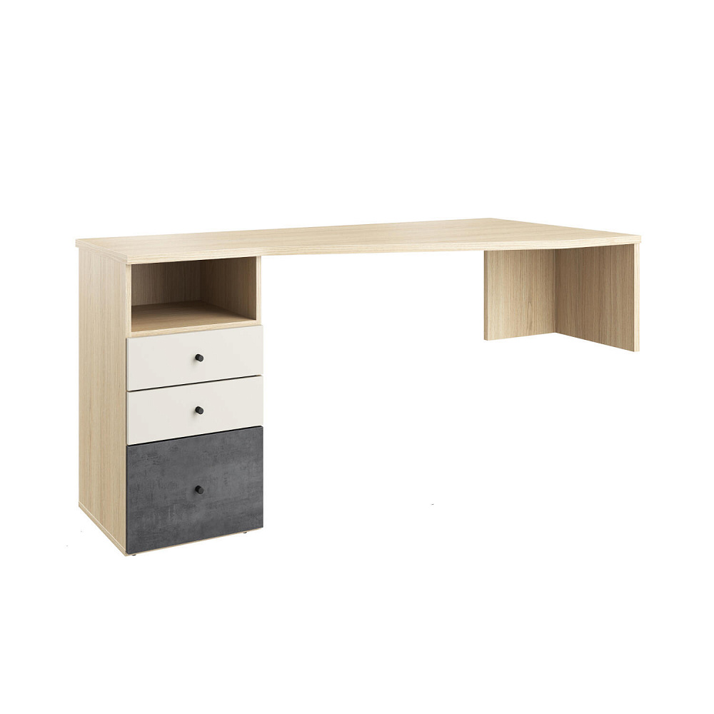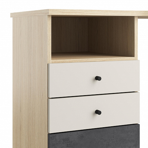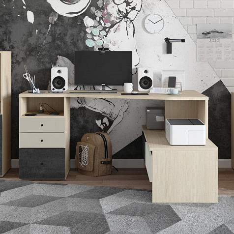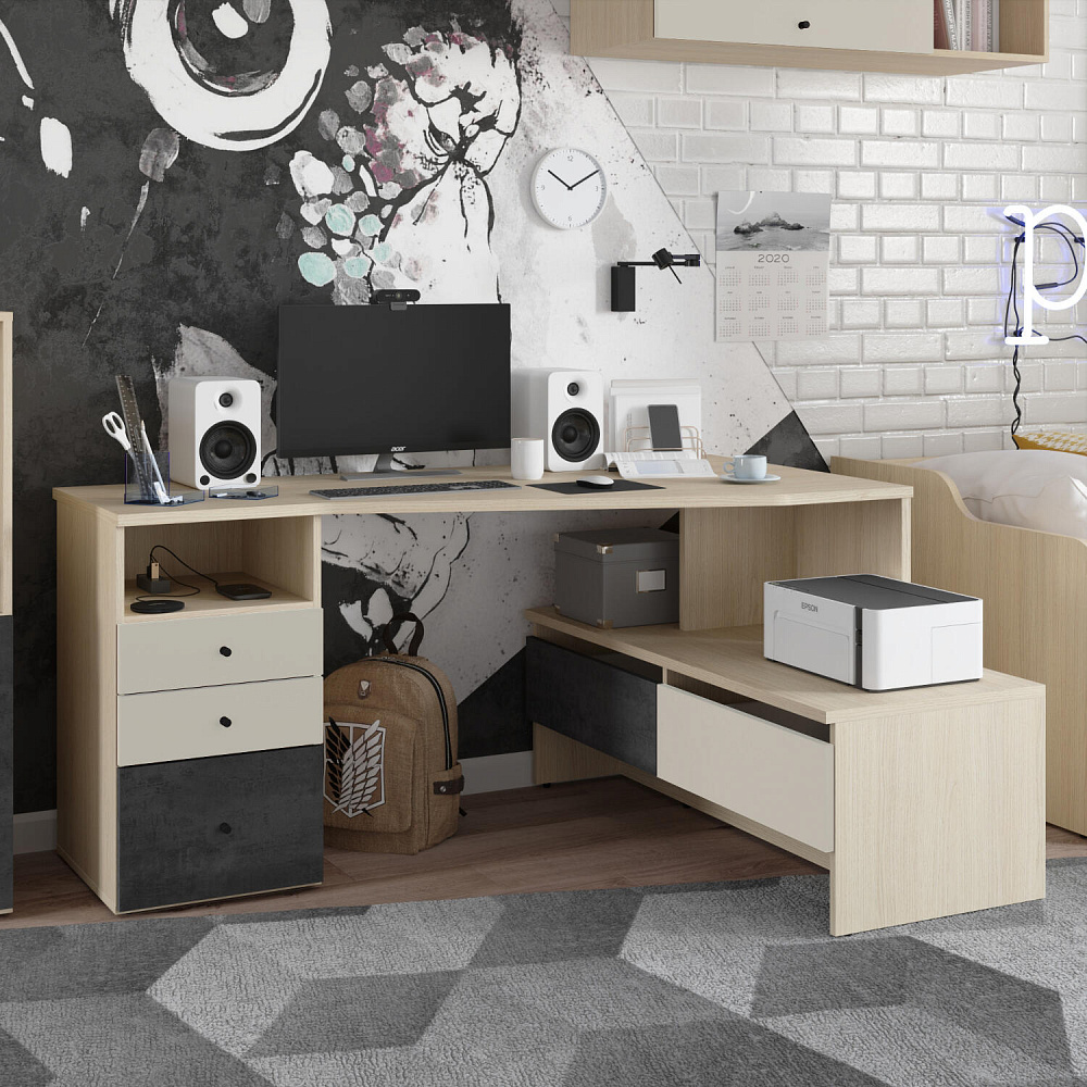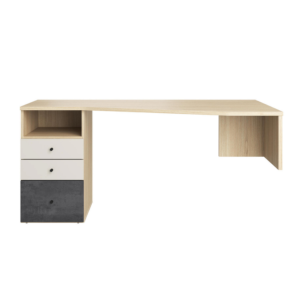 Письменный стол «Джелато» представлен в левостороннем исполнении, имеет большую рабочую зону. Такая модификация письменного стола решает вопрос расстановки мебели в небольших детских. Светлый корпус с нежной древесной текстурой, фасады в красивом дуэте глубокого серого и кашемира сделают интерьер детской стильным и современным. Коллекция «Джелато» удачно сочетает в себе стиль и комфорт.