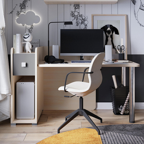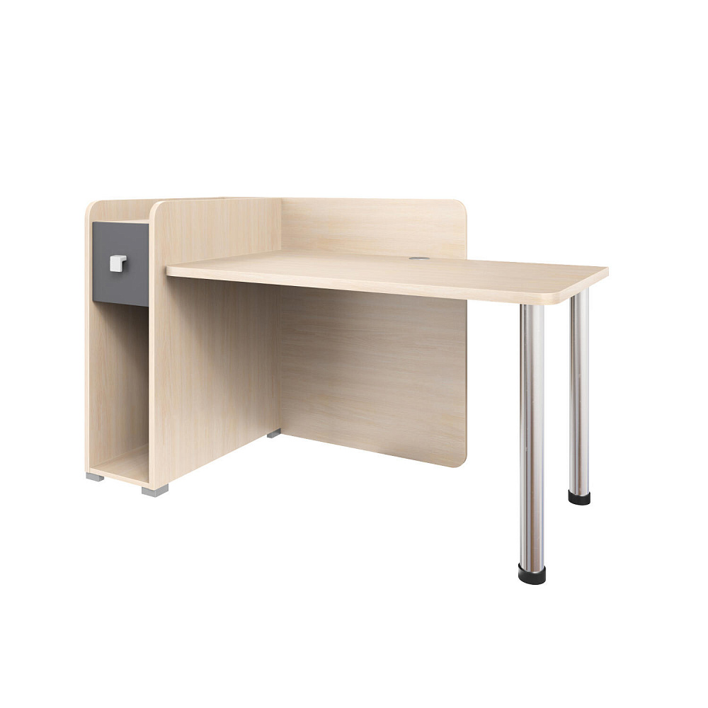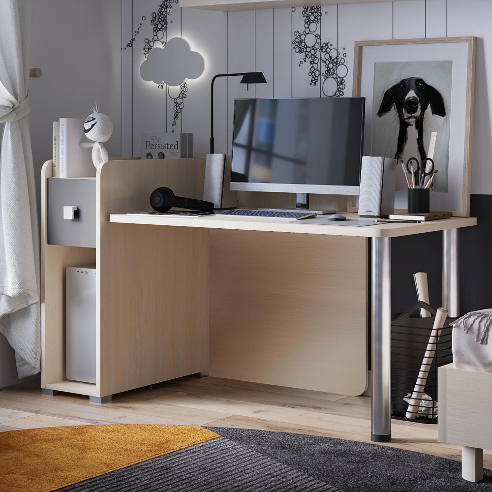 Просторная столешница с отверстием для проводов. Широкая столешница позволяет установить компьютер и разложить необходимые для учёбы и творчества материалы. В крышке стола предусмотрено отверстие для удобного вывода проводов.