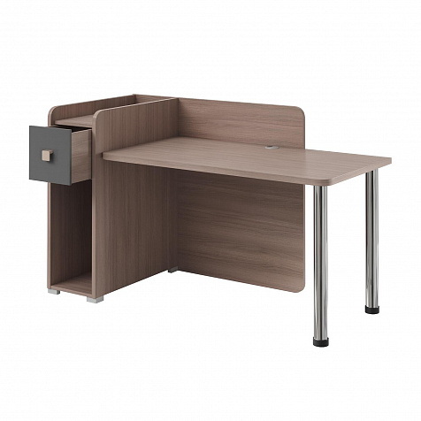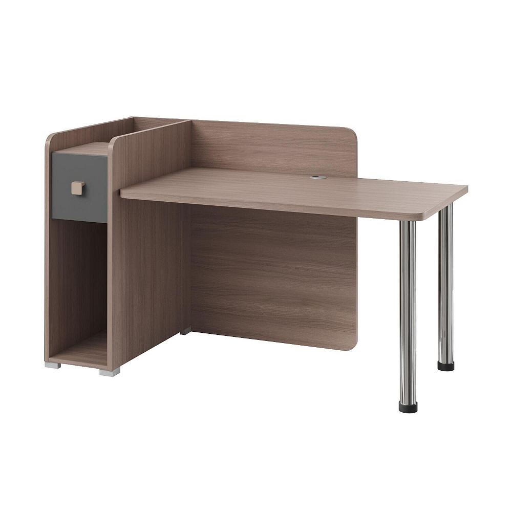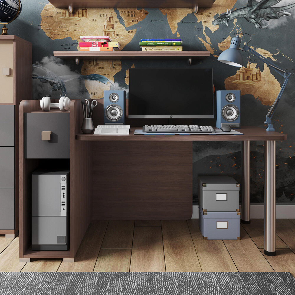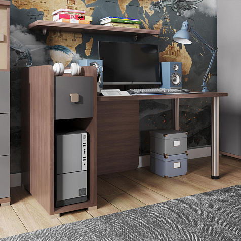 Тумба с нишей, ящиком и органайзером. Функциональная тумба имеет пространство для установки системного блока, над ней предусмотрен ящик, а за ящиком есть органайзер с двумя отделениями для канцелярских мелочей.