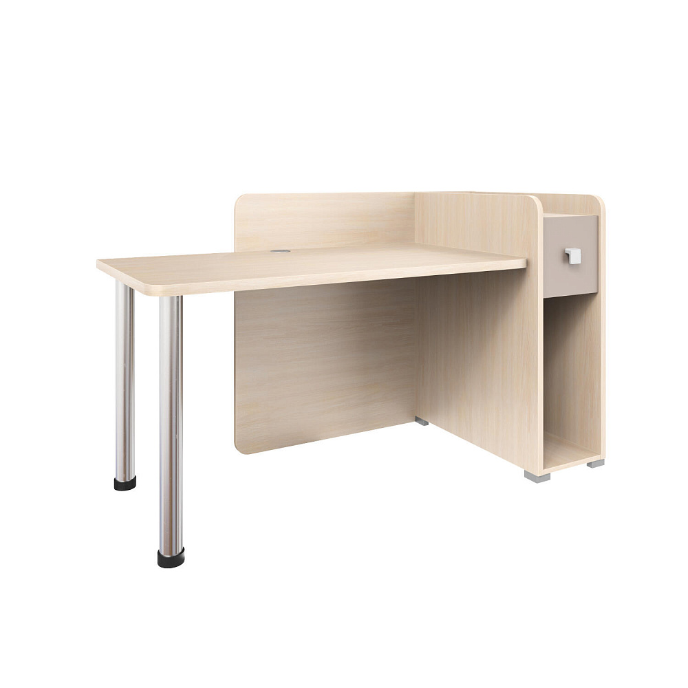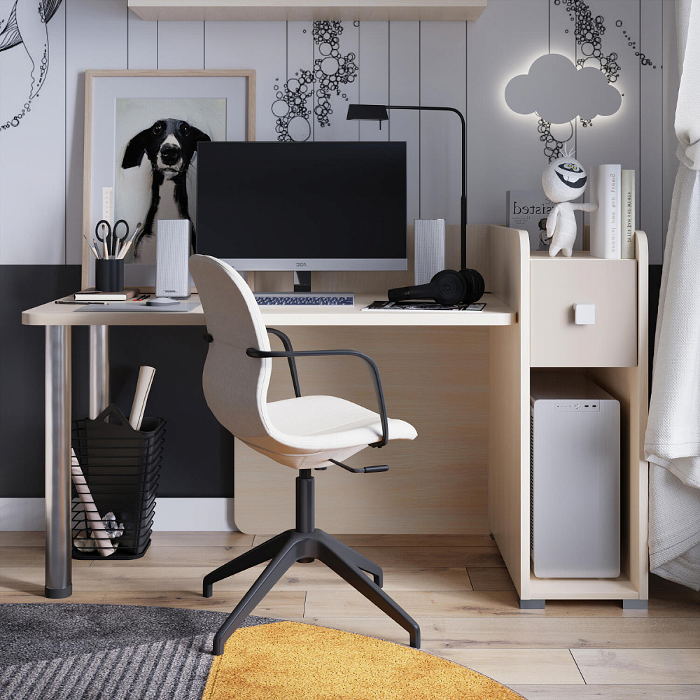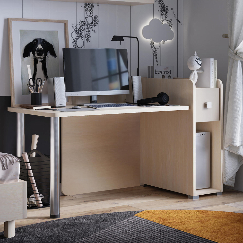 Просторная столешница с отверстием для проводов. Широкая столешница позволяет установить компьютер и разложить необходимые для учёбы и творчества материалы. В крышке стола предусмотрено отверстие для удобного вывода проводов.
