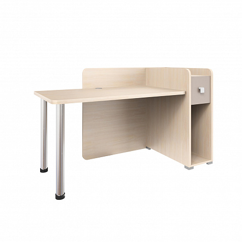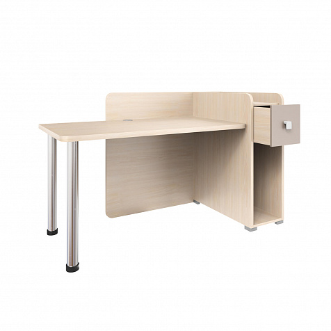 Тумба с нишей, ящиком и органайзером. Функциональная тумба имеет пространство для установки системного блока, над ней предусмотрен ящик, а за ящиком есть органайзер с двумя отделениями для канцелярских мелочей.