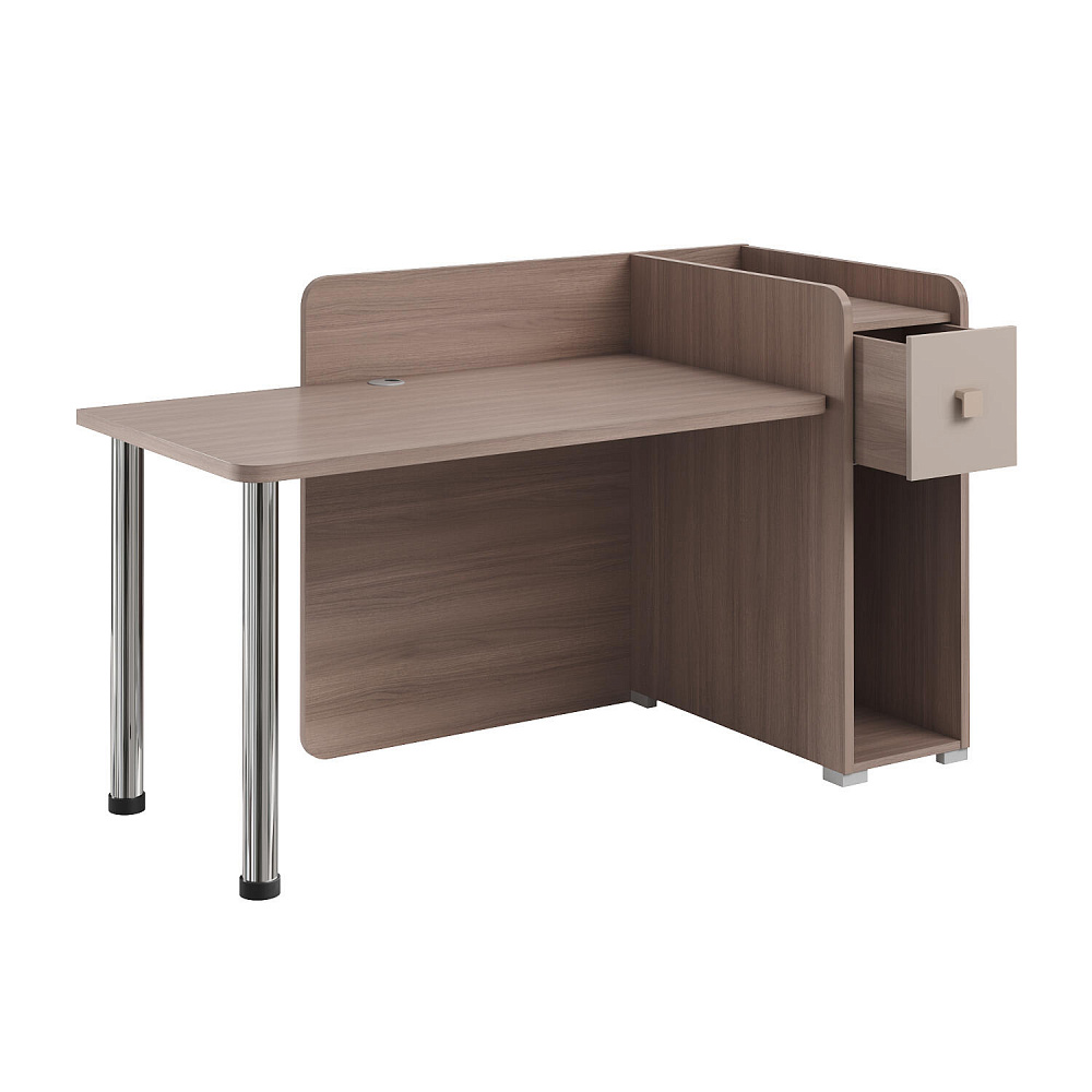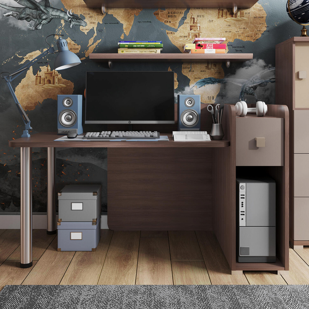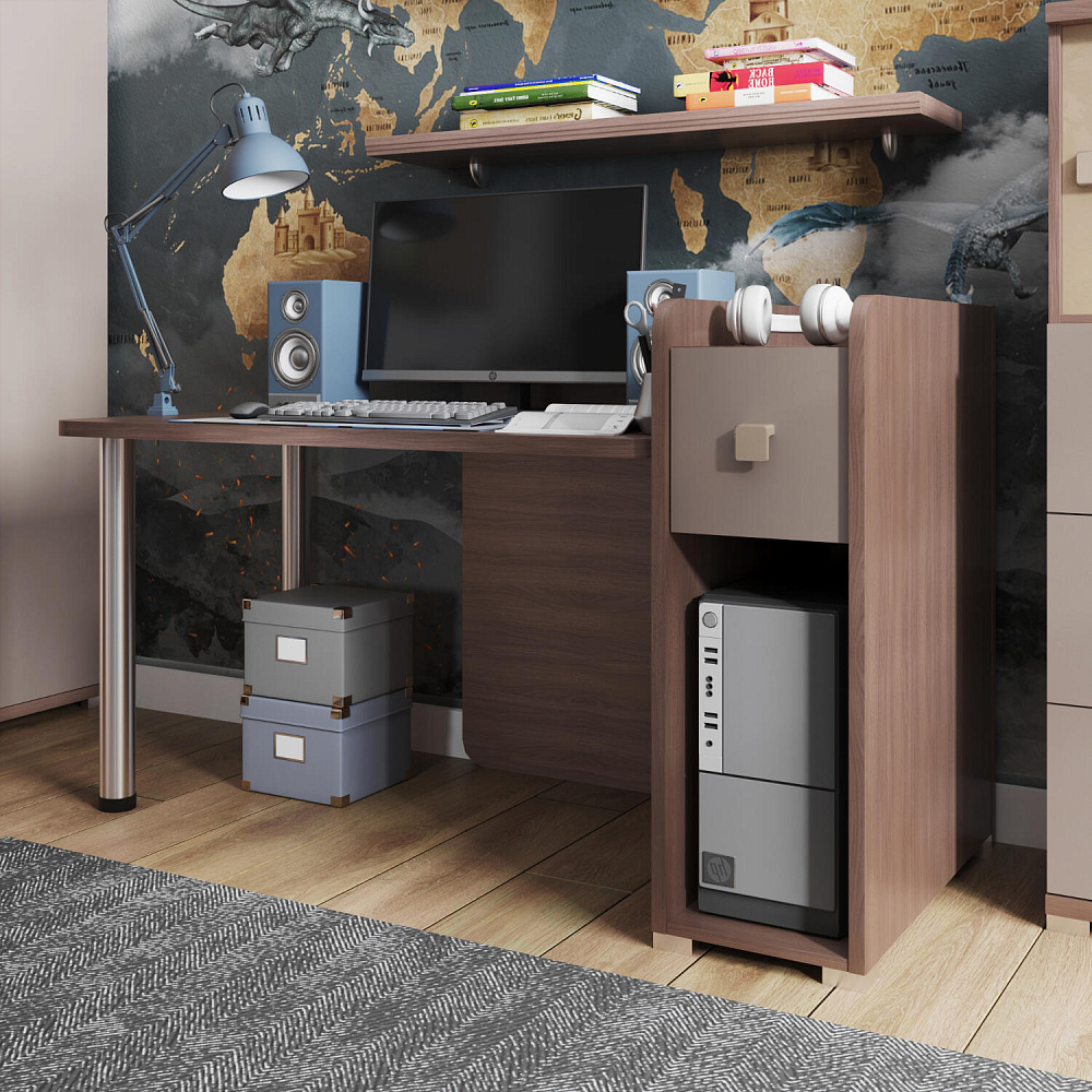 Тумба с нишей, ящиком и органайзером. Функциональная тумба имеет пространство для установки системного блока, над ней предусмотрен ящик, а за ящиком есть органайзер с двумя отделениями для канцелярских мелочей.