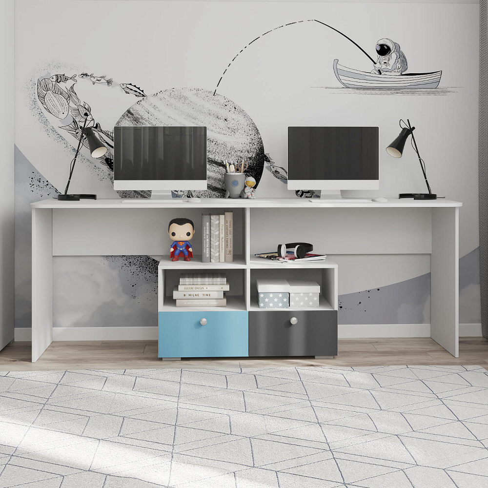 Двойной письменный стол «Кидсберг» с тумбами позволит организовать рабочее пространство сразу для двух детей. На прочных столешницах поместится моноблок мальчика и ноутбук девочки, при этом остаётся много места и для письма, и чтения, и увлекательного хобби.