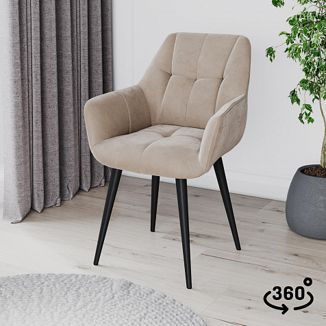 Мягкий стул «Рич» поможет создать комфортную обеденную зону на кухне или гостиной. Дизайн модели отличается аккуратными утяжками и строчкой на спинке, сиденье и подлокотниках. Обивка стула выполнена из велюра с элегантным блеском. Благодаря поворотному механизму стул не нужно отодвигать от стола, достаточно повернуть сиденье вправо или влево. Модель можно использовать в качестве дополнения к письменному или туалетному столу.