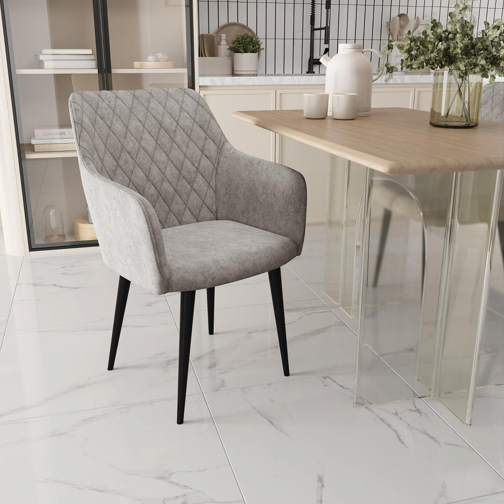 Мягкий стул с подлокотниками «Роберт» от итальянского дизайнера-конcтруктора Giovanni Lella сделает отдых комфортным и украсит интерьер. Модель выделяется ромбовидной отстрочкой на внутренней части спинки и узкими подлокотниками. Комплект из 4-6 стульев станет изящным акцентом в интерьере кухни.