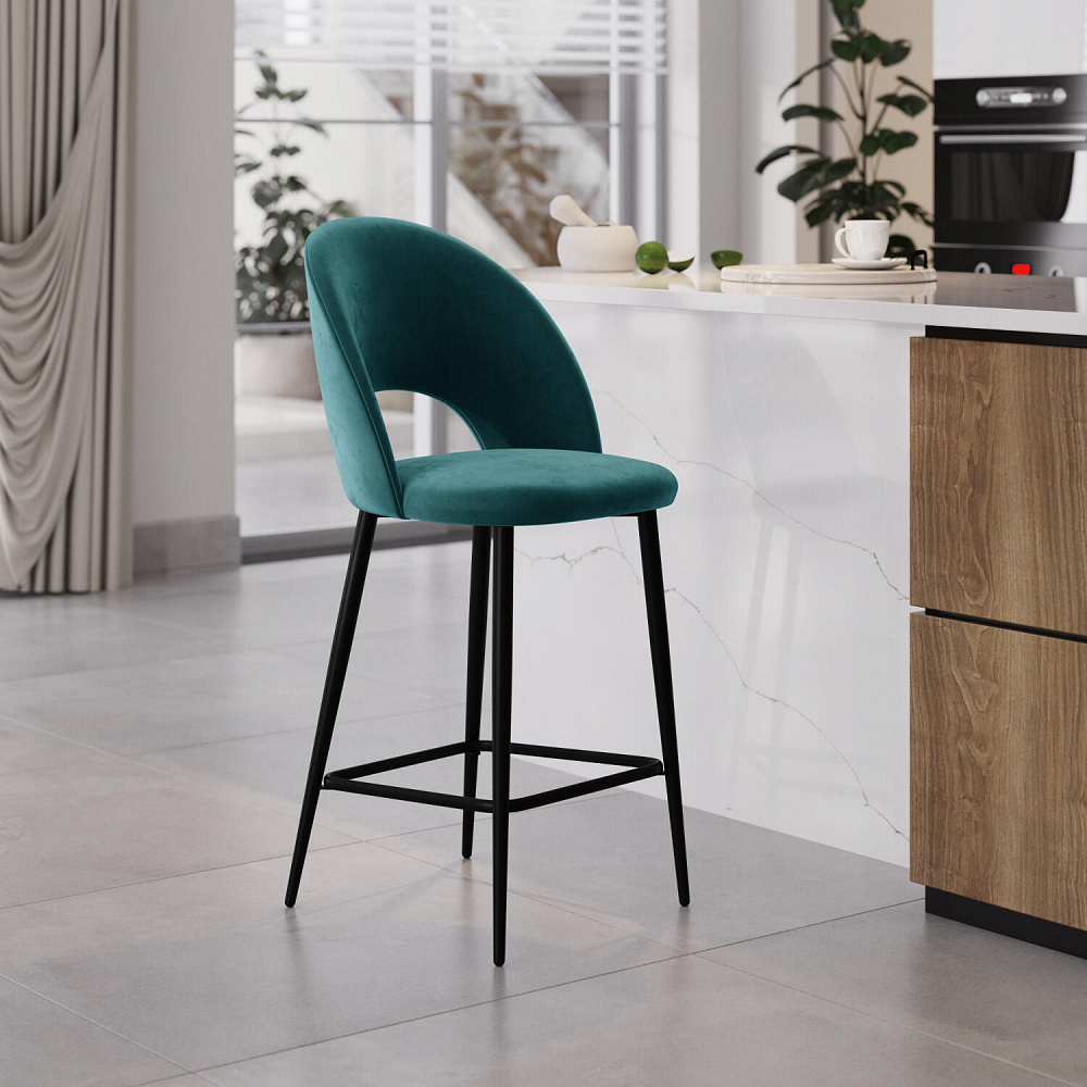 Полубарный стул «Артур» украсит кухню в любом современном стиле. Дизайн модели отличается скругленной спинкой и прорезью между спинкой и сиденьем. Мягкий велюр с элегантным блеском отлично пропускает воздух и отличается высокой износоустойчивостью. Комплект из двух-четырёх стульев станет отличным дополнением к островной кухне или барной стойке.