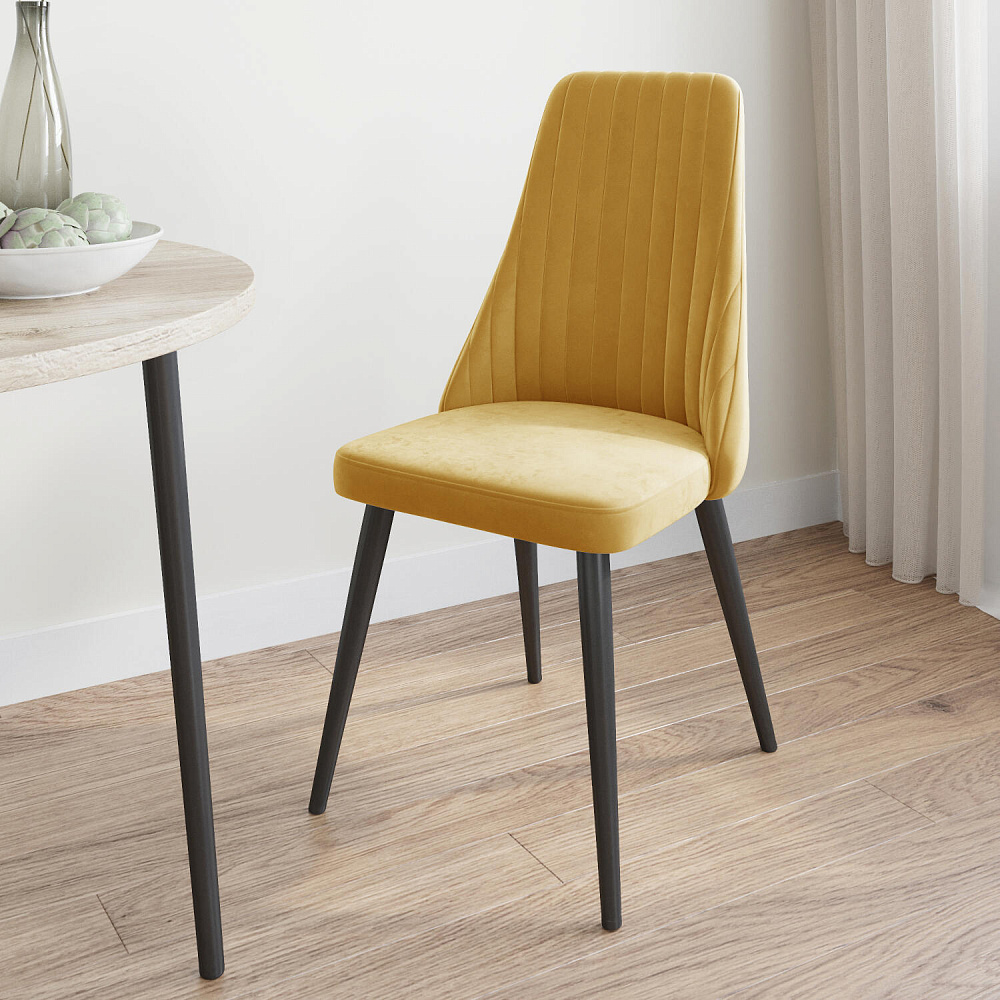 Мягкий стул «Ларри» — лаконичная модель в современном дизайне. Модель отличается высокой скругленной спинкой с ненавязчивой вертикальной прострочкой. Обивка выполнена из мягкого велюра с элегантным блеском. Комплект из 3-4 стульев поможет создать уютную обеденную зону на кухне или столовой. Также стул можно использовать в качестве дополнения к письменному или туалетному столу.