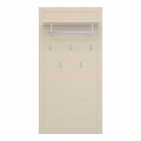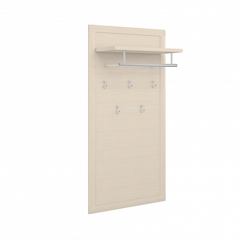 На полотно вешалки устанавливаются пять однорожковых крючков. Сверху модели располагается полка для головных уборов и шарфов, а также стальная штанга для одежды на плечиках.