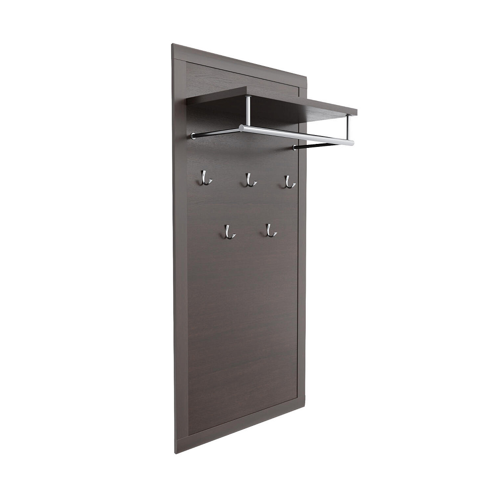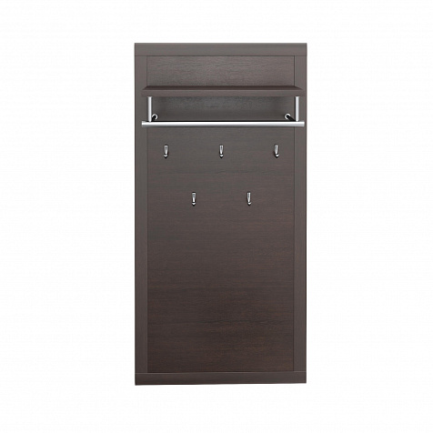 На полотно вешалки устанавливаются пять однорожковых крючков. Сверху модели располагается полка для головных уборов и шарфов, а также стальная штанга для одежды на плечиках.