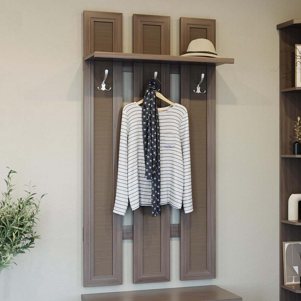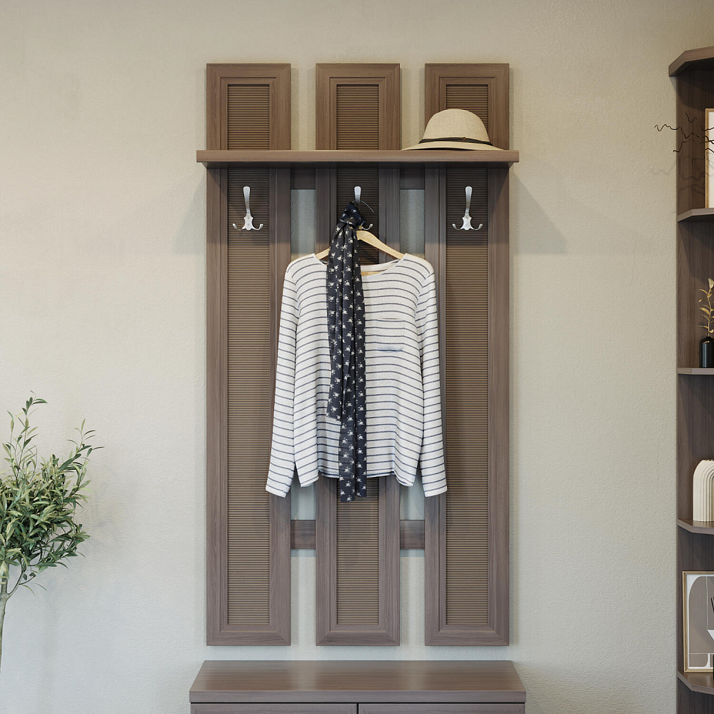 Широкая настенная вешалка «Магна» с декоративными вставками из натурального бамбука, тремя трёхрожковыми крючками и полкой для головных уборов. Модель навешивается над тумбой арт. 1830 из одноимённой коллекции или может выступать как самостоятельный элемент обстановки. Стильная настенная вешалка идеально впишется в прихожую в современном стиле.