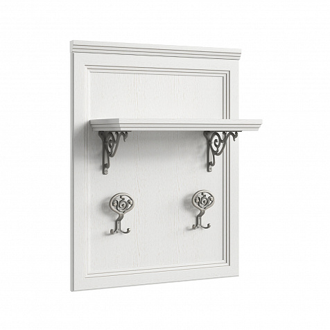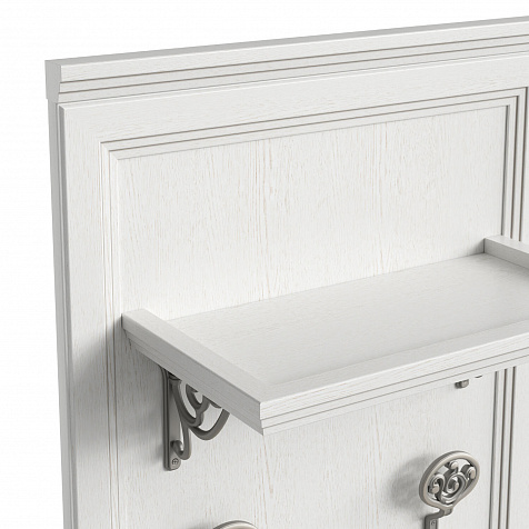 Средняя узкая настенная вешалка «Белладжио» с двумя двухрожковыми крючками для верхней одежды и полкой для головных уборов. Модель навешивается над тумбой арт. 2134 или может использоваться как самостоятельный элемент интерьера. Элегантная вешалка с изящными крючками и витыми полкодержателями гармонично дополнит классический интерьер или прихожую в стиле прованс.