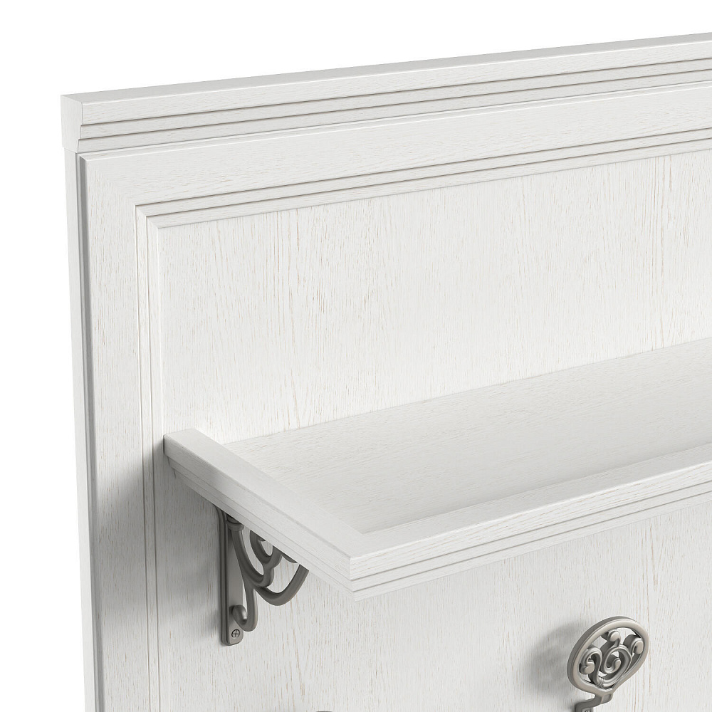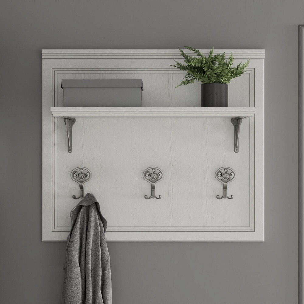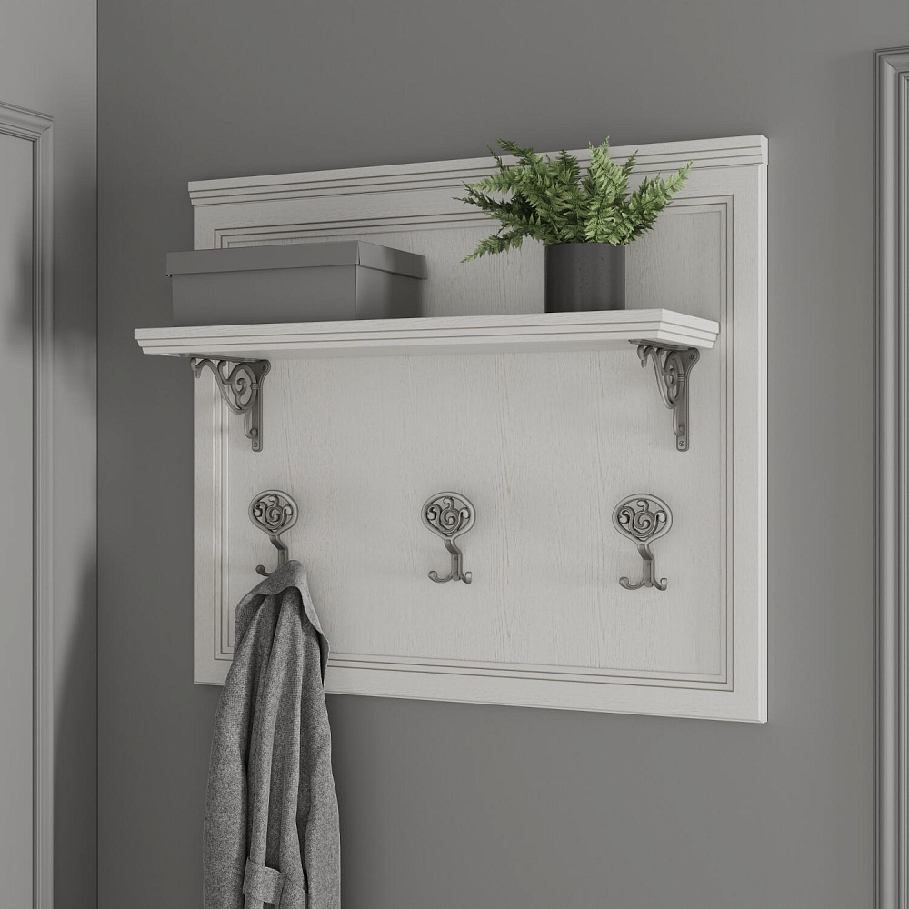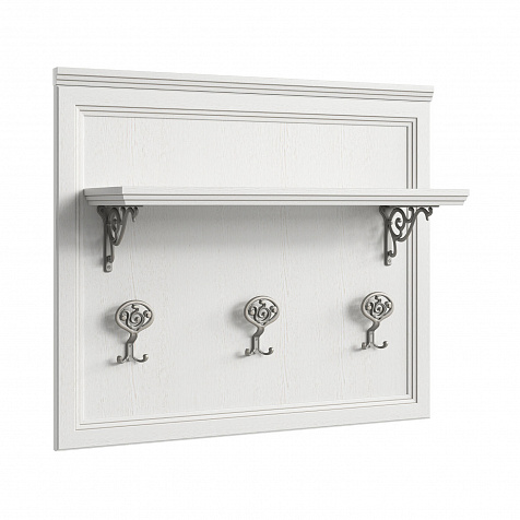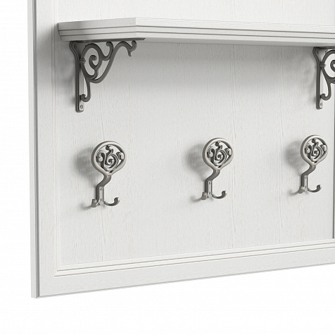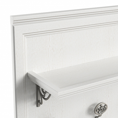 Средняя широкая настенная вешалка «Белладжио» с тремя двухрожковыми крючками для верхней одежды и полкой для головных уборов. Модель навешивается над тумбой арт. 2130 или может использоваться как самостоятельный элемент интерьера. Элегантная вешалка с изящными крючками и витыми полкодержателями гармонично дополнит классический интерьер или прихожую в стиле прованс.