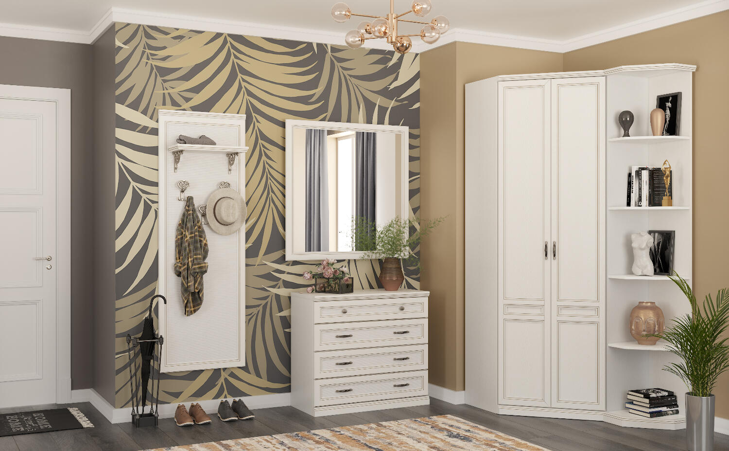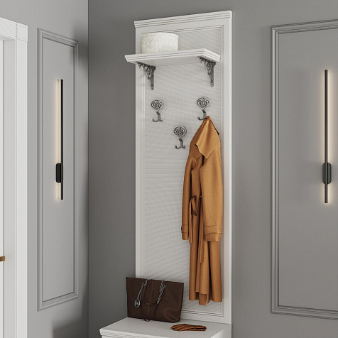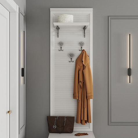 Большая узкая настенная вешалка «Белладжио» со вставкой из натурального бамбука. Модель с тремя двухрожковыми крючками для верхней одежды и полкой для головных уборов навешивается над тумбой арт. 2134 или может использоваться как самостоятельный элемент интерьера. Стильная вешалка с изящными крючками и витыми полкодержателями гармонично дополнит неоклассический интерьер прихожей.
