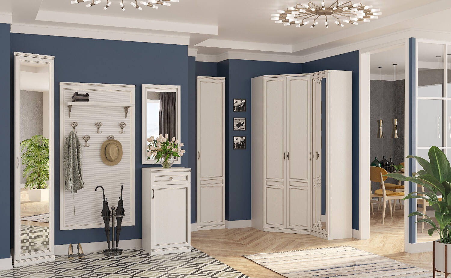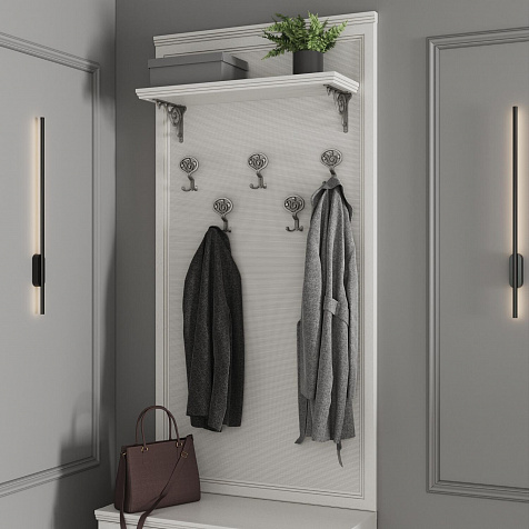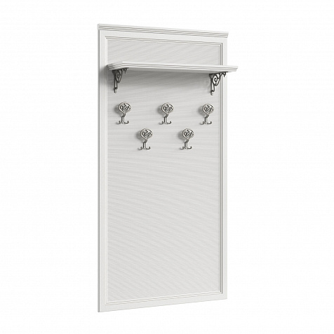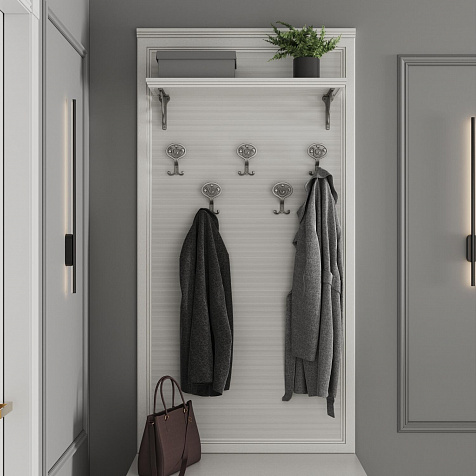 Большая широкая настенная вешалка «Белладжио» со вставкой из натурального бамбука. Модель с пятью двухрожковыми крючками для верхней одежды и полкой для головных уборов навешивается над тумбой арт. 2130 или может использоваться как самостоятельный элемент интерьера. Стильная вешалка с изящными крючками и витыми полкодержателями гармонично дополнит неоклассический интерьер прихожей.