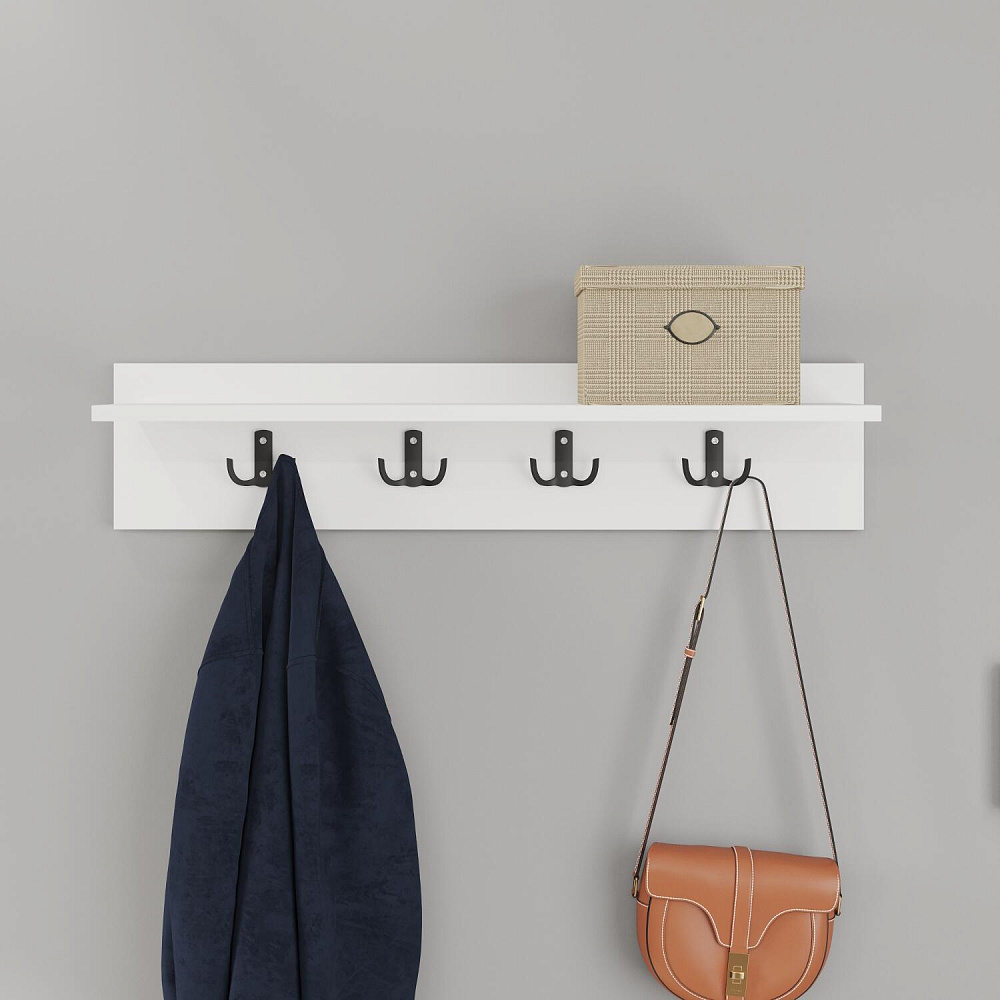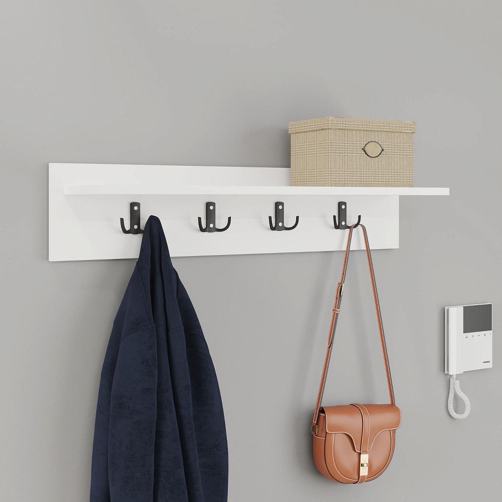 На полотно вешалки устанавливаются четыре крючка. Сверху располагается полка для головных уборов и шарфов.
