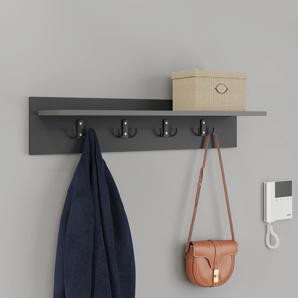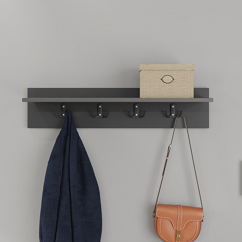 На полотно вешалки устанавливаются четыре крючка. Сверху располагается полка для головных уборов и шарфов.