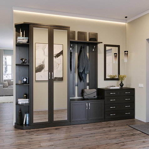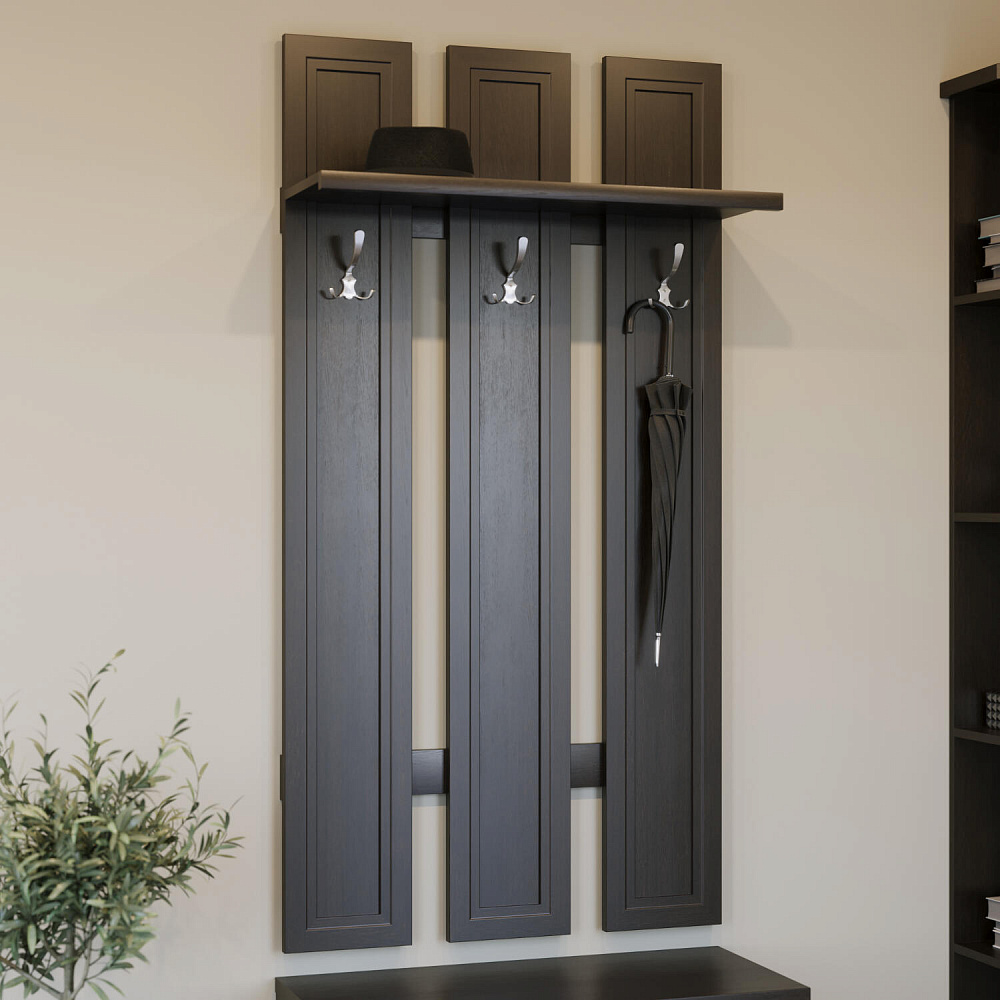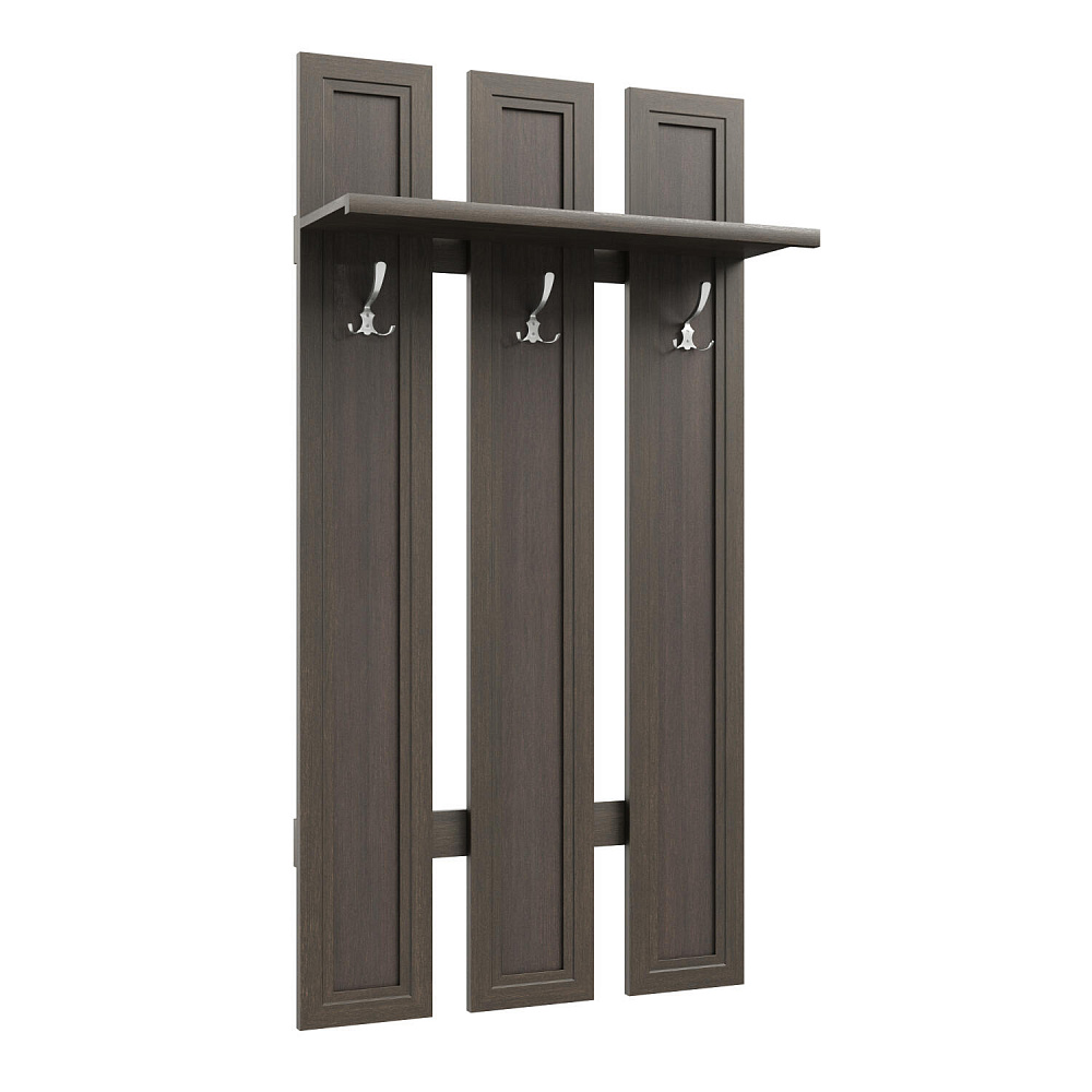 Широкая настенная вешалка «Магна» с тремя трёхрожковыми крючками и полкой для головных уборов. Модель навешивается над тумбой арт. 1830 из одноимённой коллекции или может выступать как самостоятельный элемент обстановки. Настенная вешалка в строгом, лаконичном дизайне идеально впишется в прихожую в современном стиле.