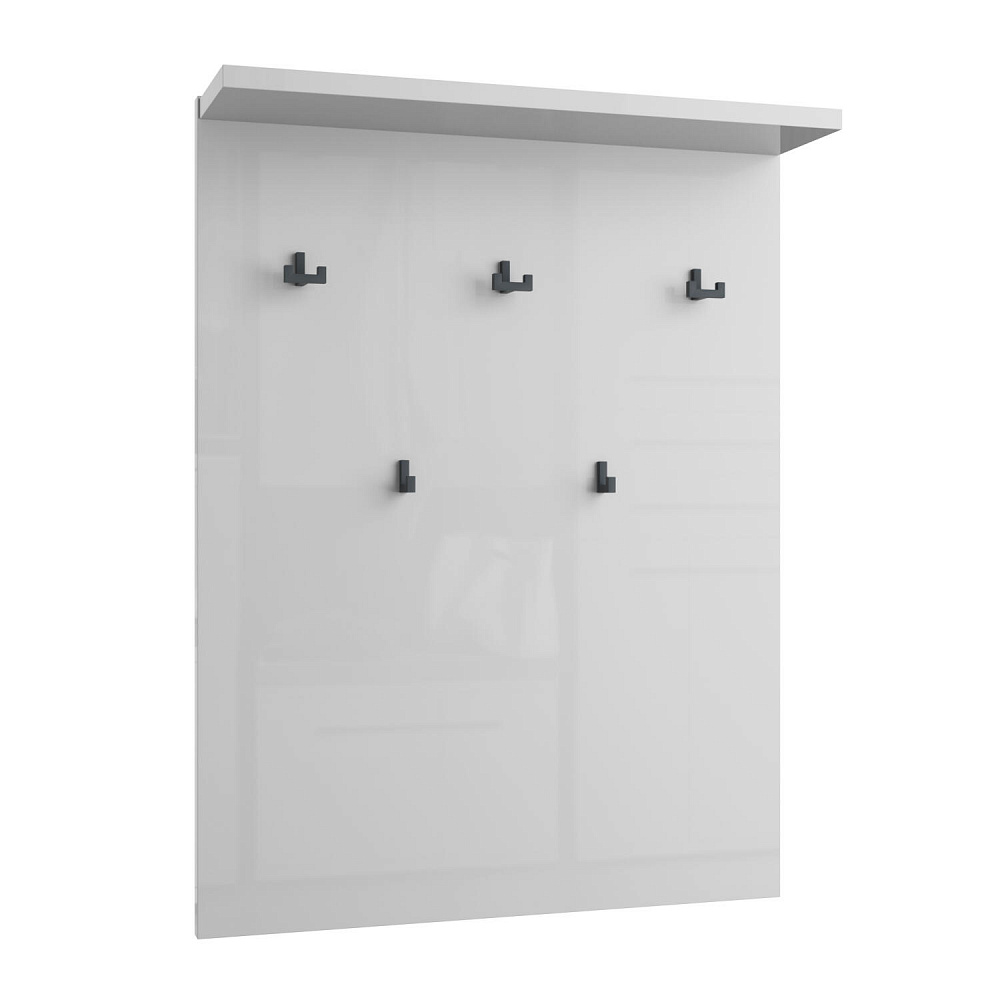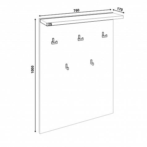 Широкая настенная вешалка Piano станет неотъемлемой частью прихожей в современном стиле. Идеально сочетается с тумбой арт. 54835, создавая единую стилистическую композицию. На полотно вешалки устанавливаются три двухрожковых крючка и два — однорожковых. Сверху располагается полка для головных уборов и шарфов.