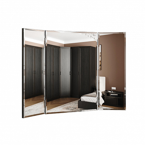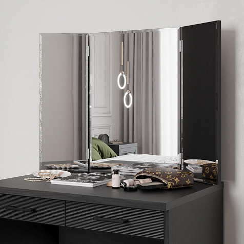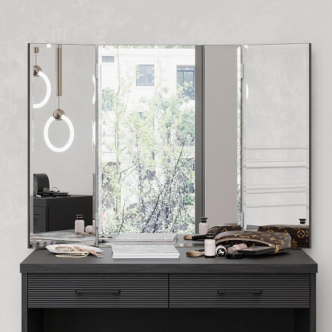 Зеркало-трельяж «Магна» представляет собой конструкцию из центральной панели и двух подвижных зеркальных крыльев. Модуль удобен для нанесения макияжа и создания причесок: сдвинув боковые панели к центру, можно оценить созданный образ со всех сторон.