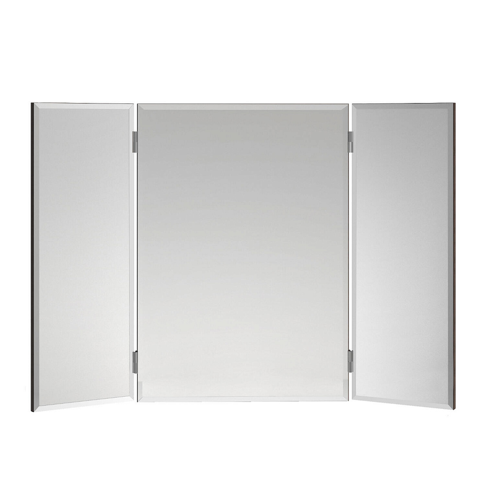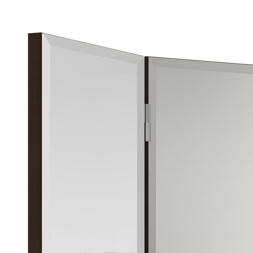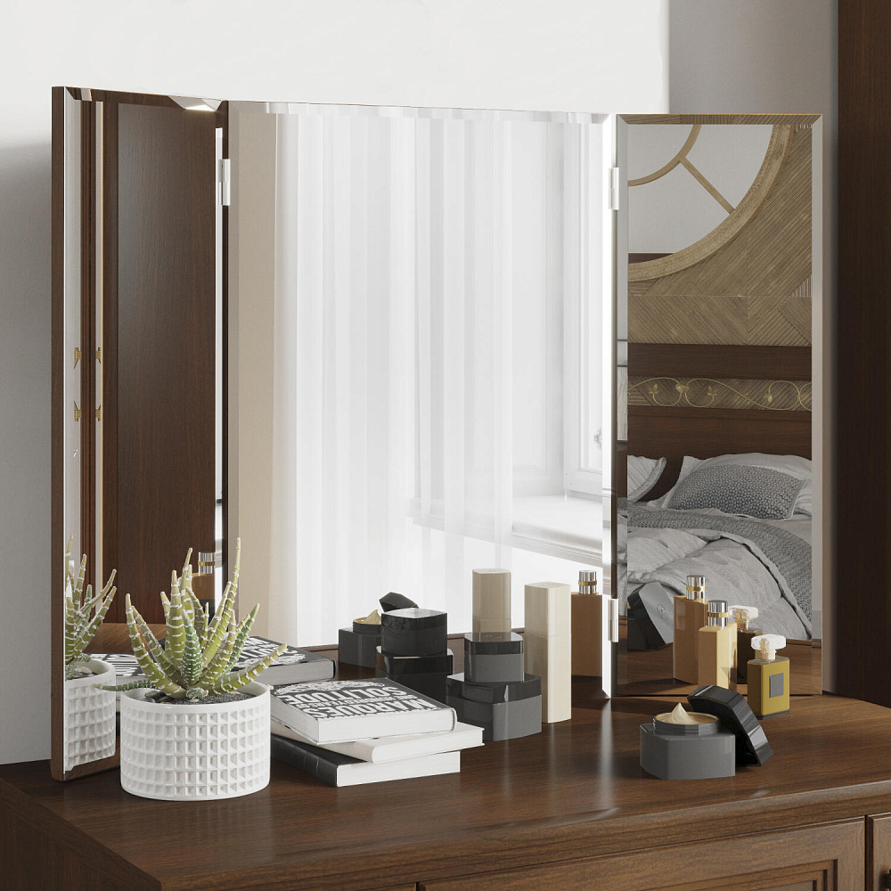 Зеркало-трельяж «Белладжио» представляет собой конструкцию из центральной панели и двух подвижных зеркальных крыльев. Модель очень удобна для нанесения макияжа и создания причесок: сдвинув боковые панели к центру, можно оценить созданный образ со всех сторон.