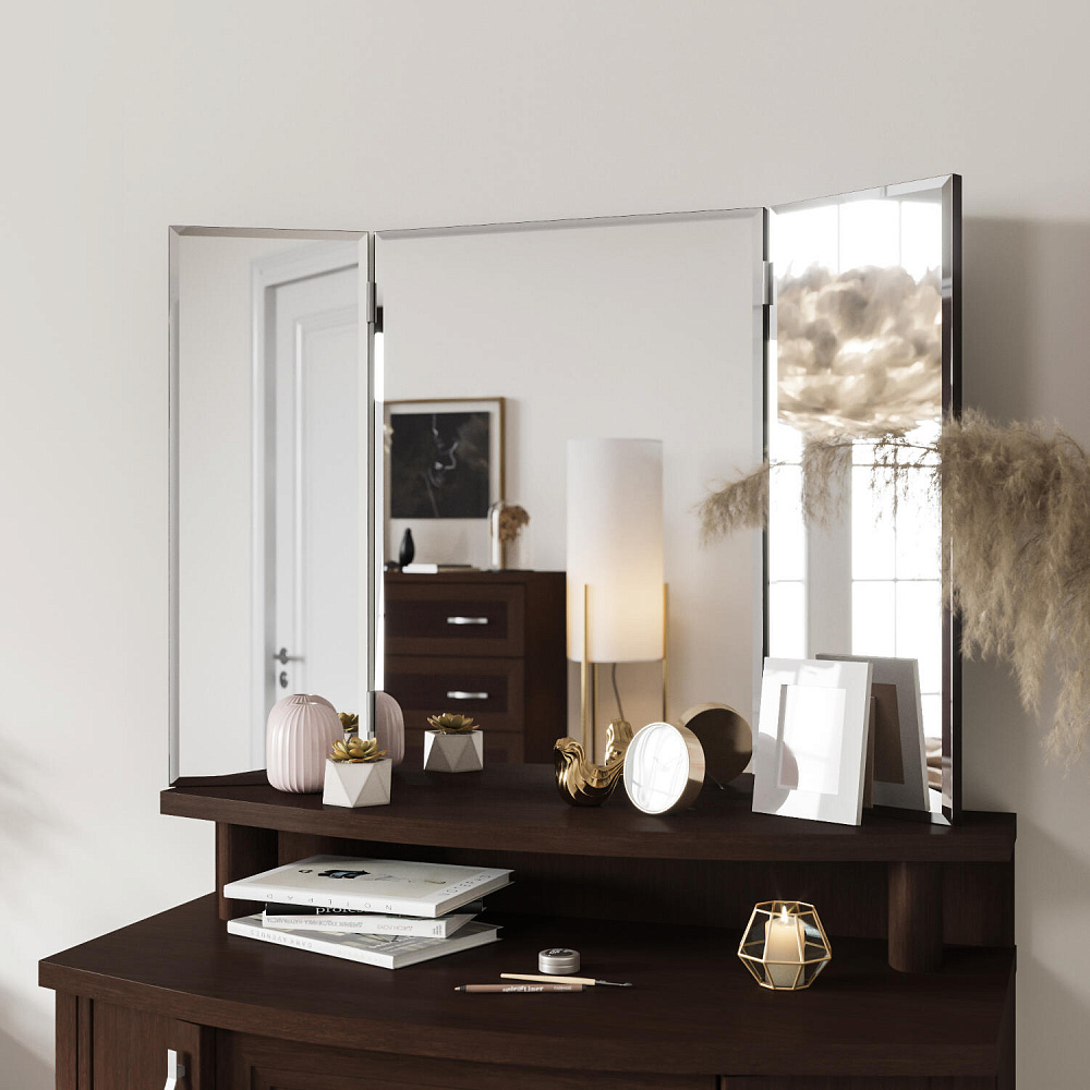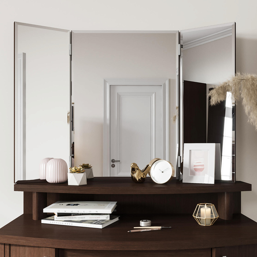 Зеркало-трельяж «Магна» представляет собой конструкцию из центральной панели и двух подвижных зеркальных крыльев. Модуль удобен для нанесения макияжа и создания причесок: сдвинув боковые панели к центру, можно оценить созданный образ со всех сторон.
