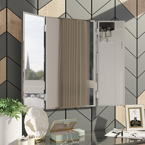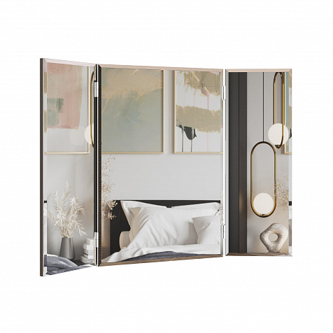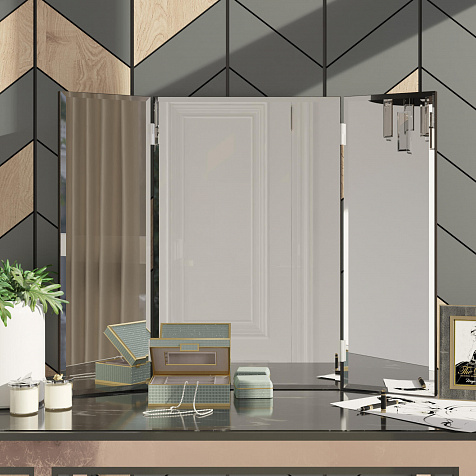 Зеркало-трельяж «Илона» устанавливается к задней стенке туалетного стола арт. 5248 из одноименной коллекции. Модель представляет собой конструкцию из центральной панели и двух подвижных зеркальных крыльев. Зеркало-трельяж — удобная деталь для нанесения макияжа и создания причесок: сдвинув боковые панели к центру, можно оценить созданный образ со всех сторон.
