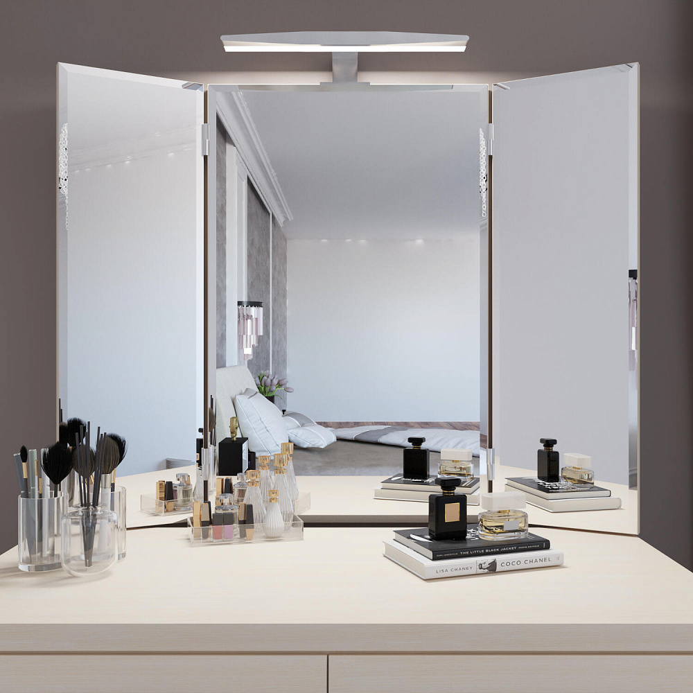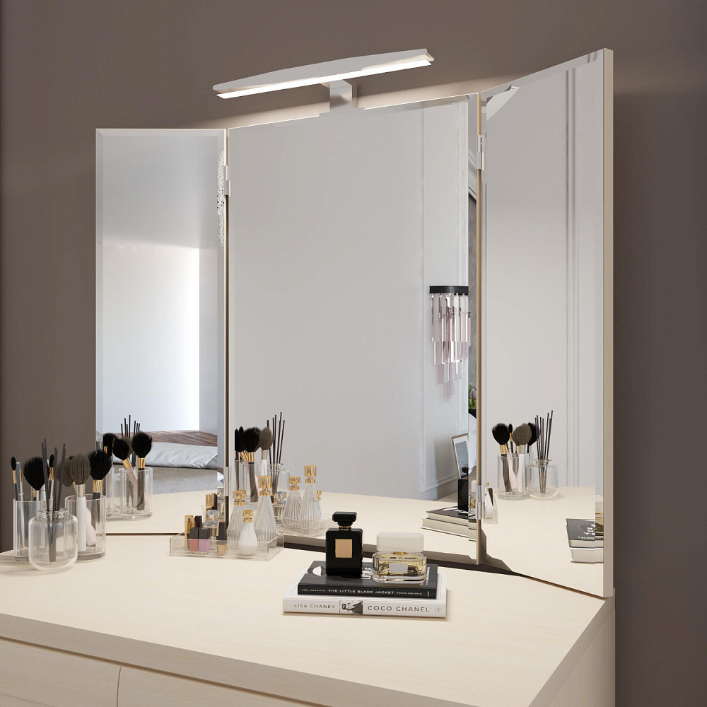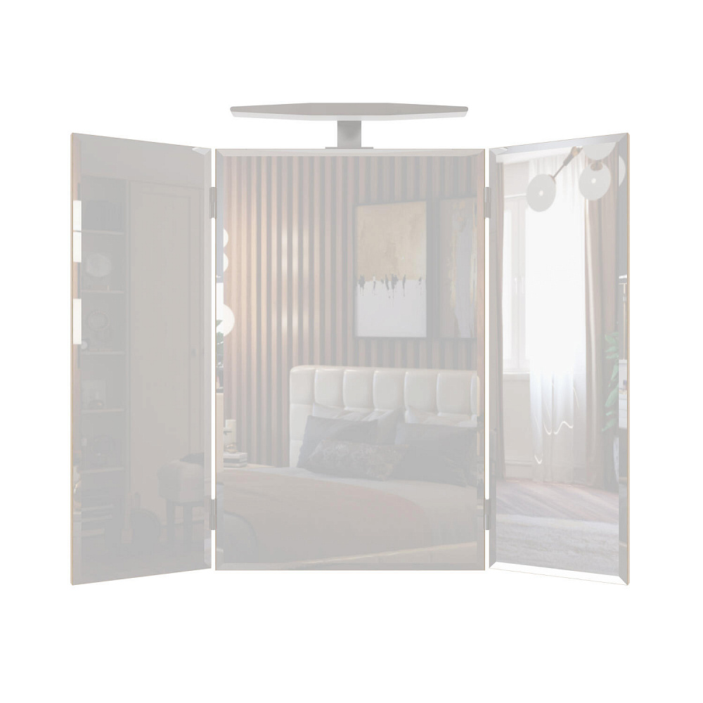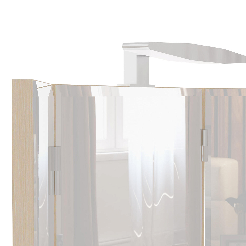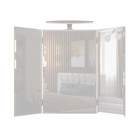 Зеркало-трельяж с подсветкой «Орнета» устанавливается к задней стенке туалетного стола арт. 4868 из одноименной коллекции. Модель представляет собой конструкцию из центральной панели и двух подвижных зеркальных крыльев, светодиодный светильник устанавливается на центральную панель сверху. Зеркало-трельяж — удобная деталь для нанесения макияжа и создания причесок: сдвинув боковые панели к центру, можно оценить созданный образ со всех сторон. Сенсорный контакт позволит быстро включить/выключить подсветку касанием петли.