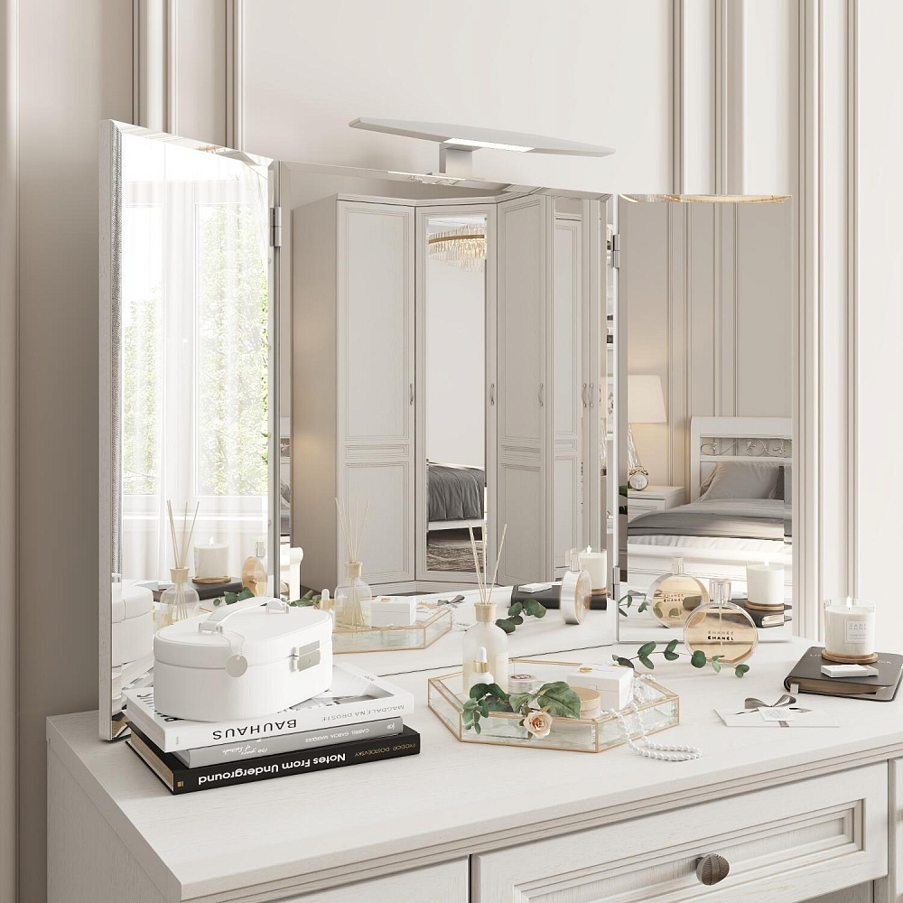 Зеркало-трельяж с подсветкой «Белладжио» представляет собой конструкцию из центральной панели и двух подвижных зеркальных крыльев. Модель очень удобна для нанесения макияжа и создания причесок: сдвинув боковые панели к центру, можно оценить созданный образ со всех сторон. На центральную панель сверху устанавливается небольшой светильник с мягким светом. Сенсорный контакт крепится к одной из петель зеркала, после чего светильник включается/выключается касанием этой петли.
