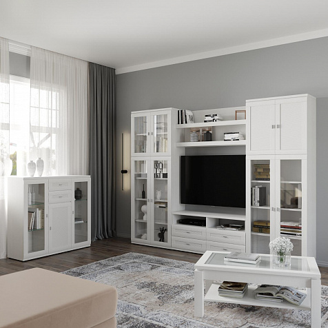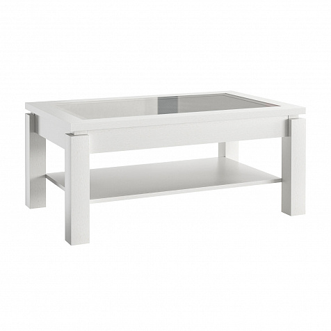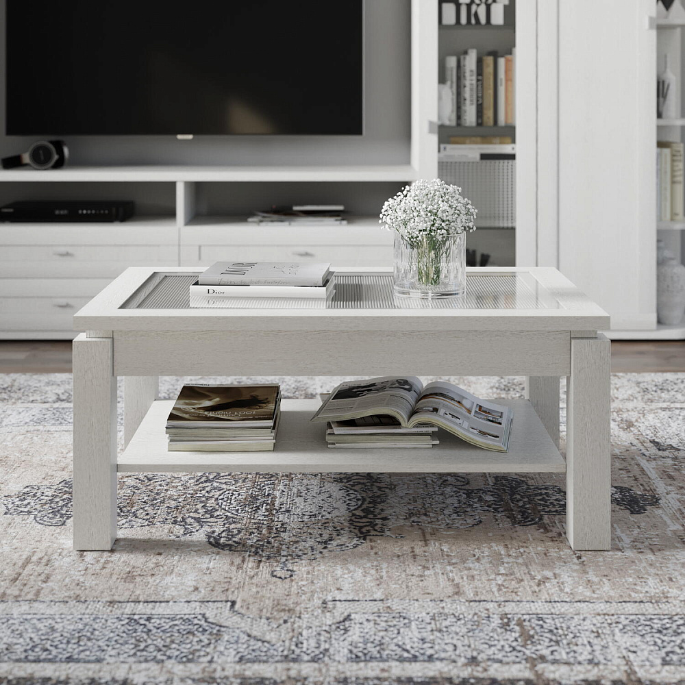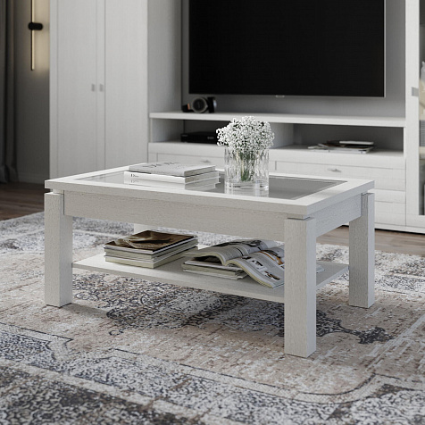 Журнальный столик «Орнета» — широкий прямоугольный стол с утолщенной столешницей, украшенной вставкой из бамбука под стеклом. Под ней находится полка для книг, журналов и пульта от телевизора. Элегантная и лаконичная модель станет завершающим элементом гостиной и удобным местом для сервировки чая к приему гостей.