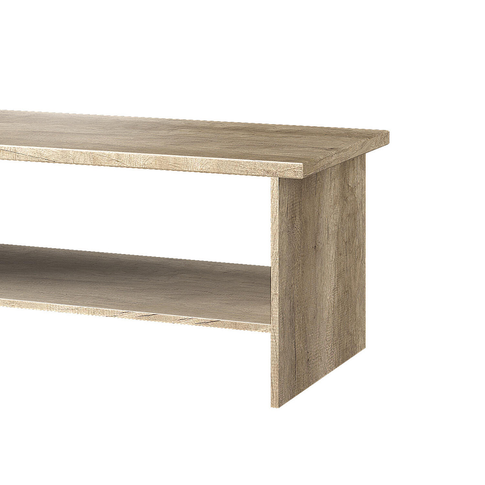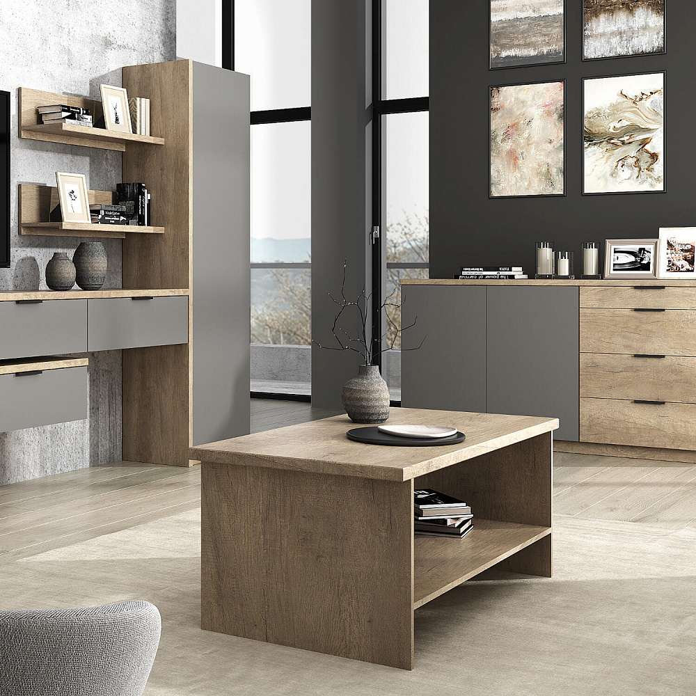 Журнальный стол «Стэнфорд» с нижней полкой — функциональный предмет мебели для гостиной. Столик гармонично дополнит практически любой интерьер, позволит организовать зону для приема гостей, хранения вещей и аксессуаров.
