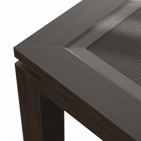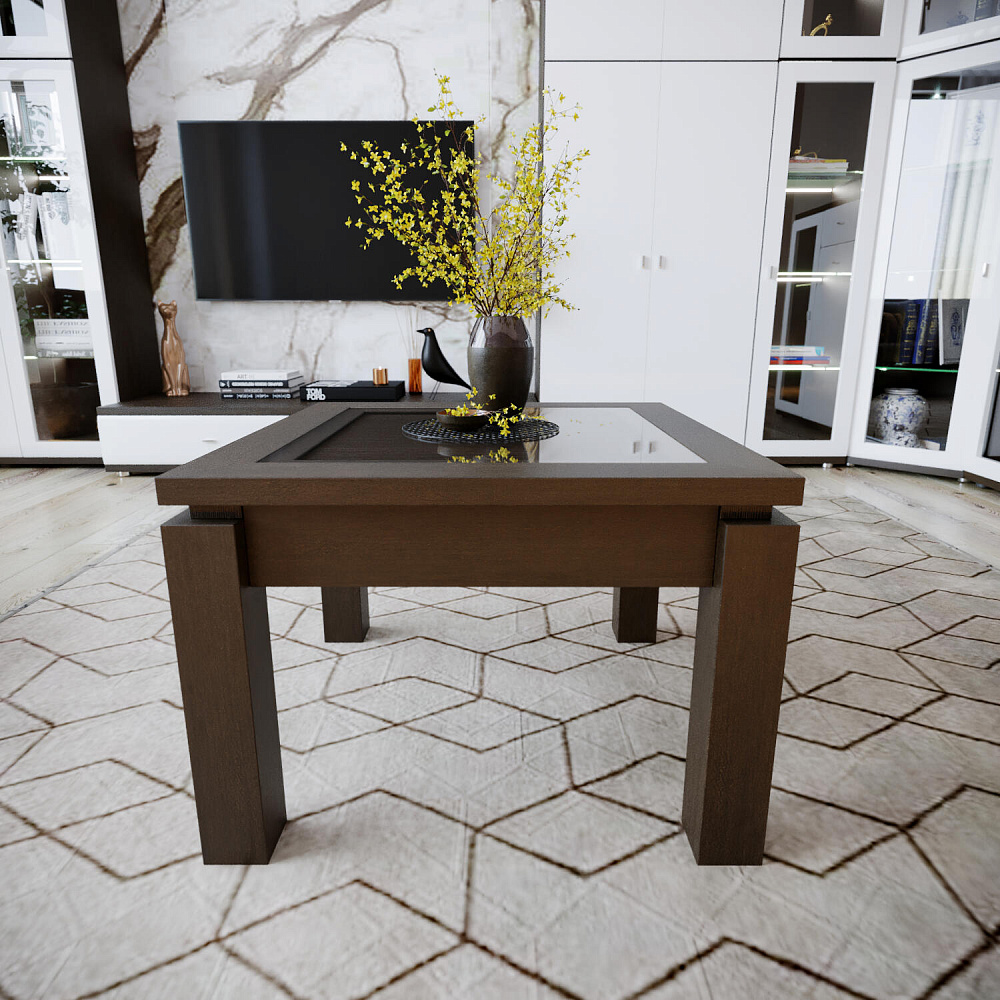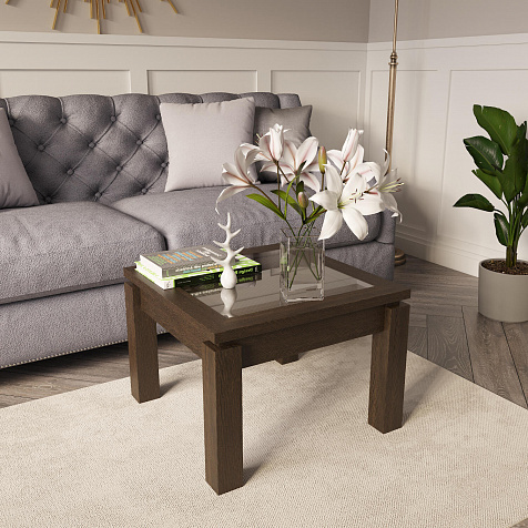 Журнальный столик «Орнета» — маленький квадратный стол с утолщенной столешницей, украшенной вставкой из бамбука под стеклом. Элегантная и лаконичная модель станет завершающим элементом гостиной и удобным местом для сервировки чая к приему гостей.